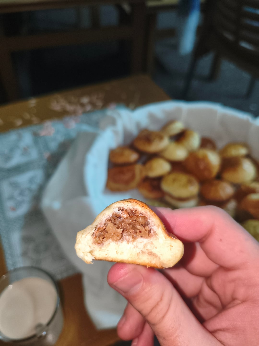 For the dough: one teaspoon of yeast with wheat and two whole butters. For the filling: one kilo of walnuts (actually 450 grams + 50 grams I ate because I discarded the outer shell) with cardamom, cinnamon, and sugar. Mix and crush together. Cook in an old electric oven, about 20 years old, the bottom part of which doesn’t work.