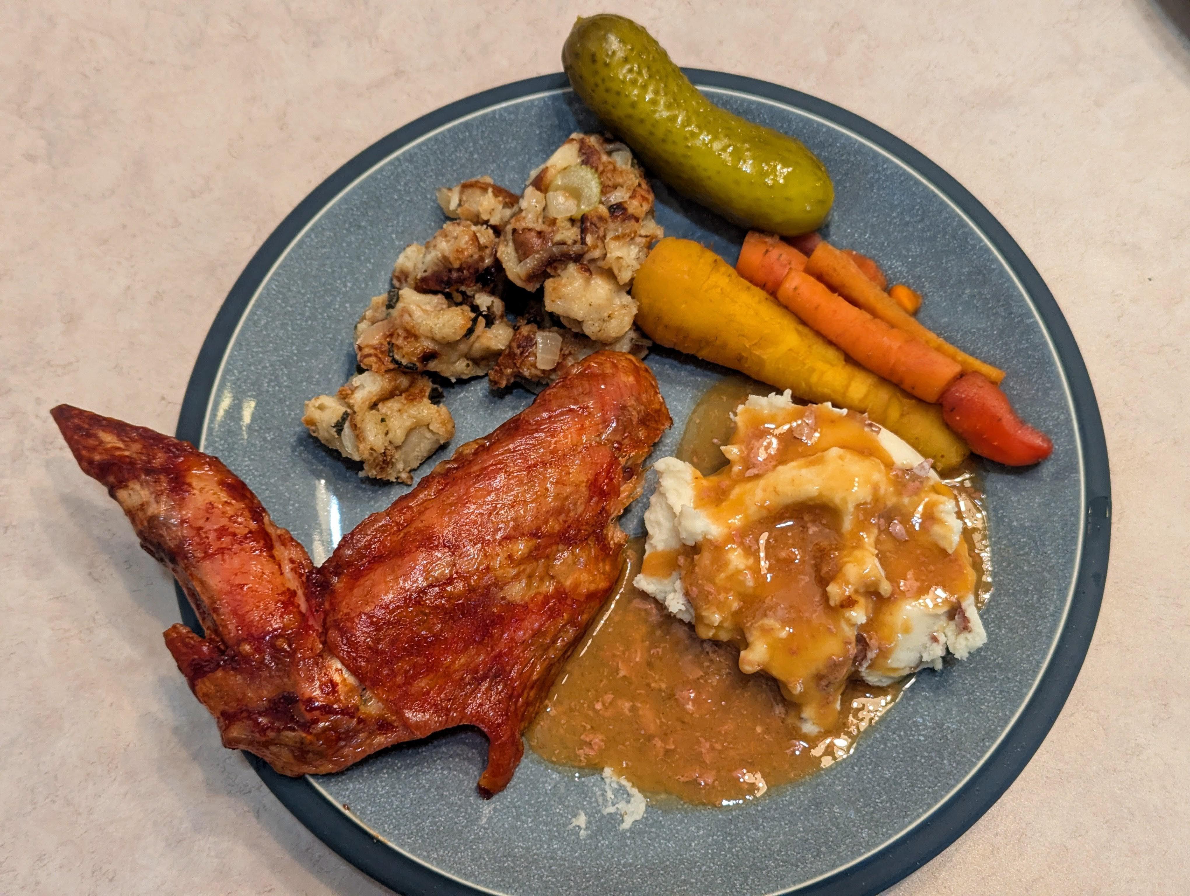 All side dishes were scratch made except the zesty pickle and the potatoes / carrots came out of the home garden. The carrots were steamed and served with lightly seasoned melted butter (optional). The mashed potatoes were made w/ unsalted butter & cream cheese for extra goodness. The stuffing is a slight riff of my parents old family recipe. We also made our own cranberry sauce, though it’s not part of this serving.