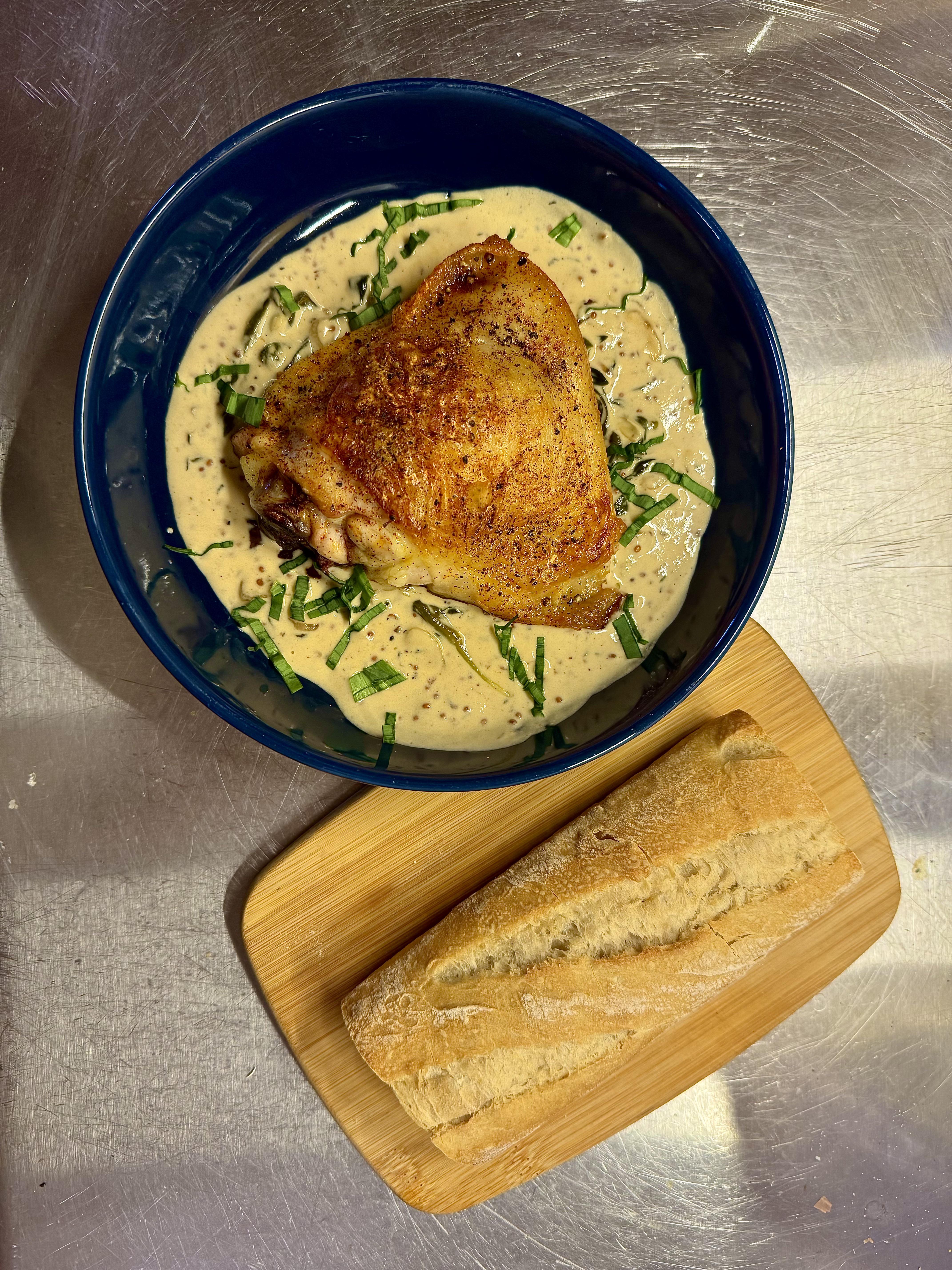Poulet à la moutarde with ramps and baguette!