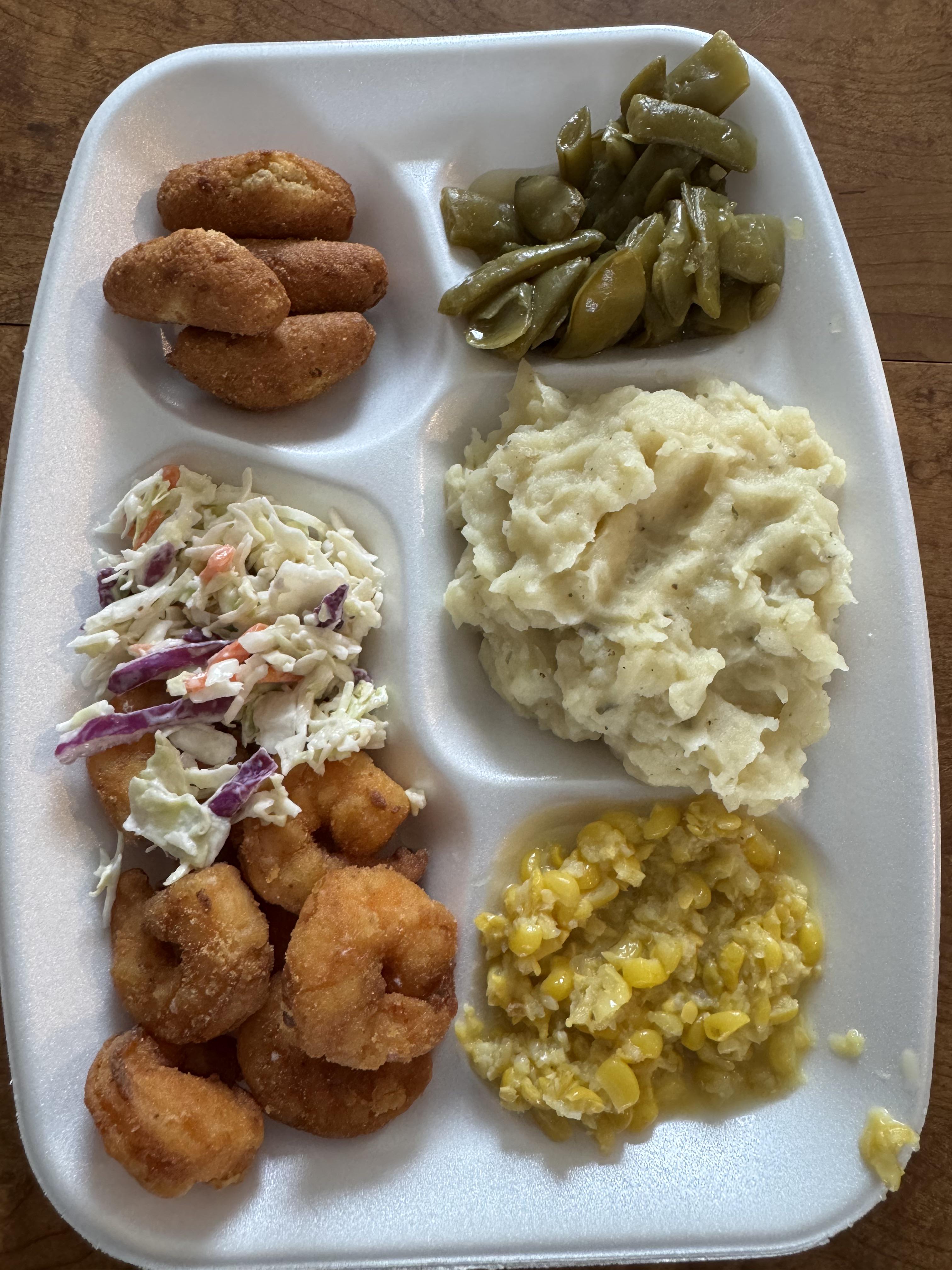 Tonight’s dinner is fried shrimp and cole slaw, mashed potatoes, cream corn, string beans, and hush puppies.