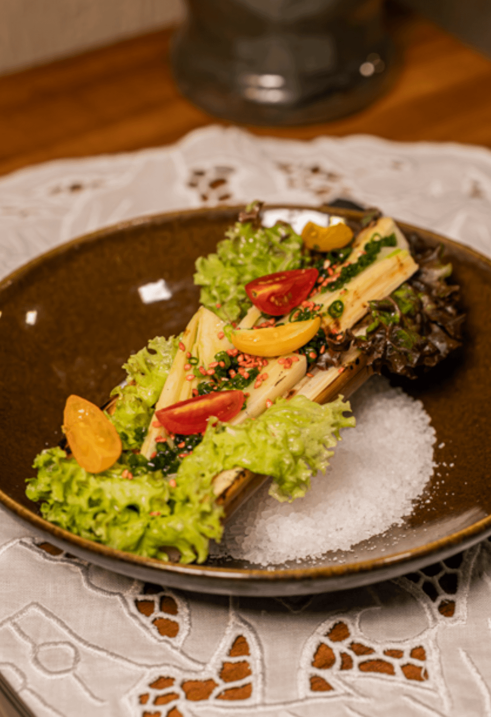 I smoked the heart of palm, scooped out the flesh, and cut it into thick batons that I blowtorched very gently. The last layer of the shell is a smooth, tough later that works great as a eating surface. Course salt to stabilize it.