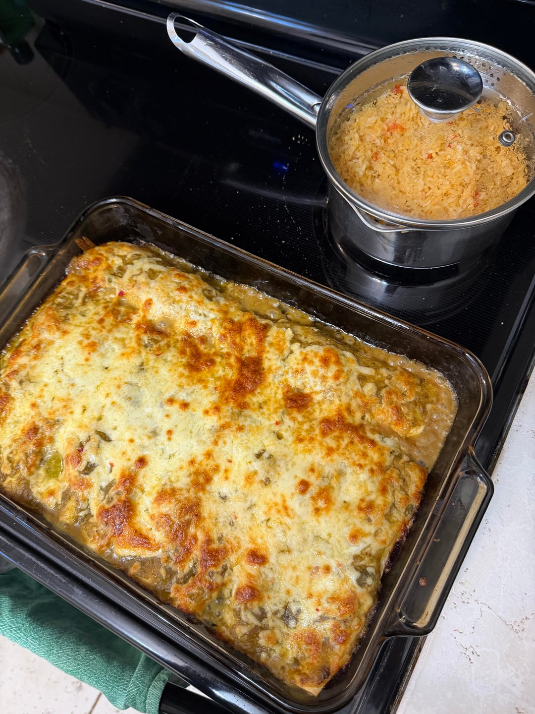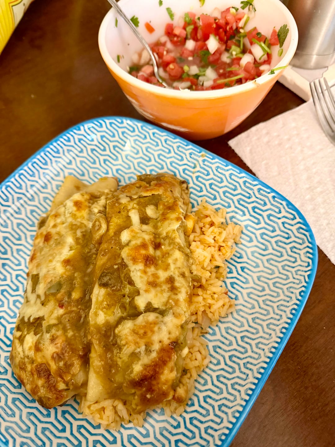[homemade] chicken and black bean enchiladas verdes with Mexican rice and pico