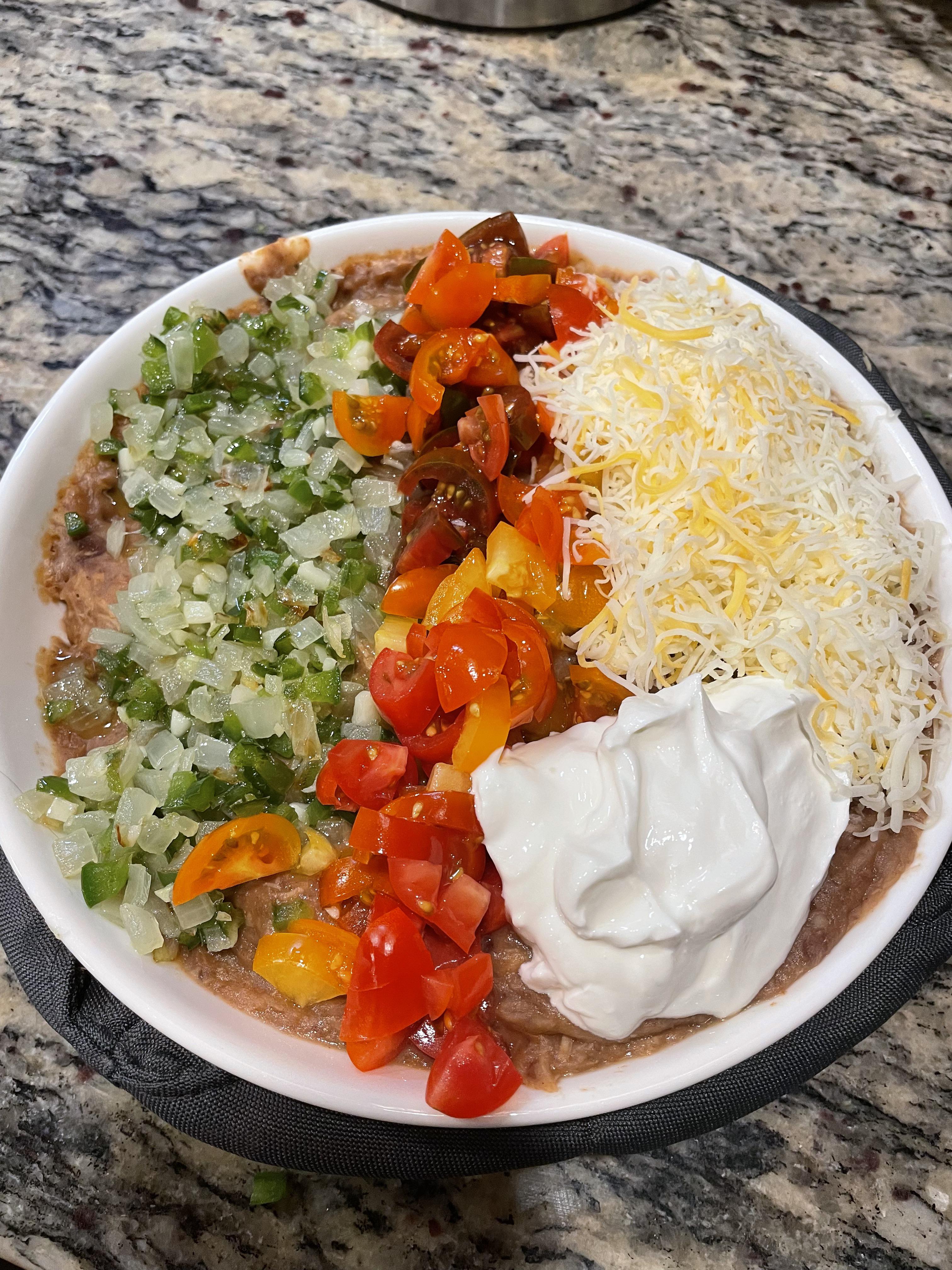 I didn’t have any pinto beans, but I did have these cranberry beans, so I threw them in the instant pot and flavored them the same way I would to make refried beans. I used some leftover pulled pork that I unthawed to round out the flavor of the beans. I sautéed some onions and jalapeño with garlic to add to the finished product, then added diced cherry tomatoes, sour cream, and some shredded cheese.