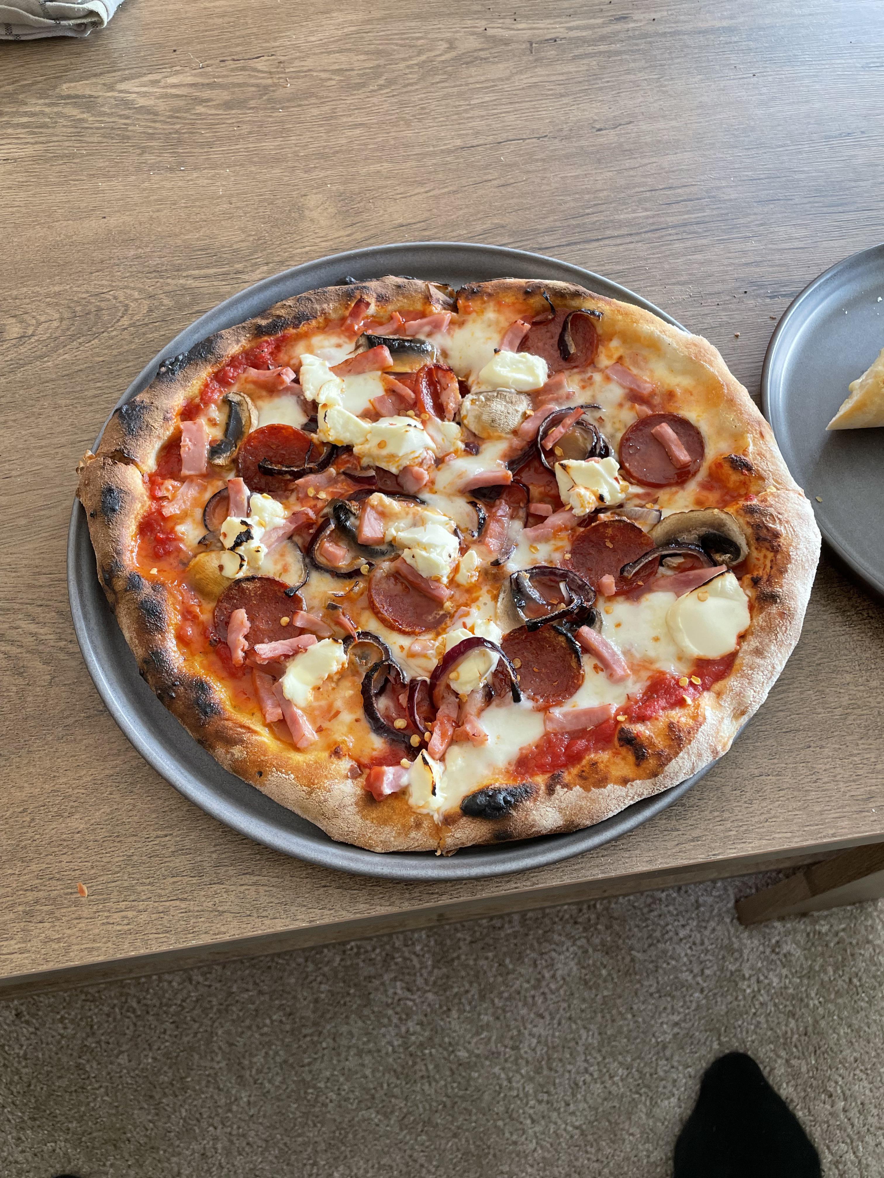 [homemade] Pizza with Chorizo, ham, mushrooms, red onion, goats cheese, honey, and chilli flakes. Yes I’m hungover.