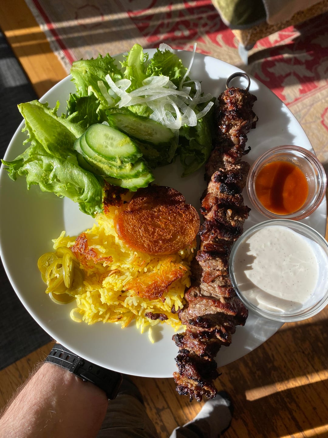 Beef kebabs, tahdig, salad, white sauce & hot sauce