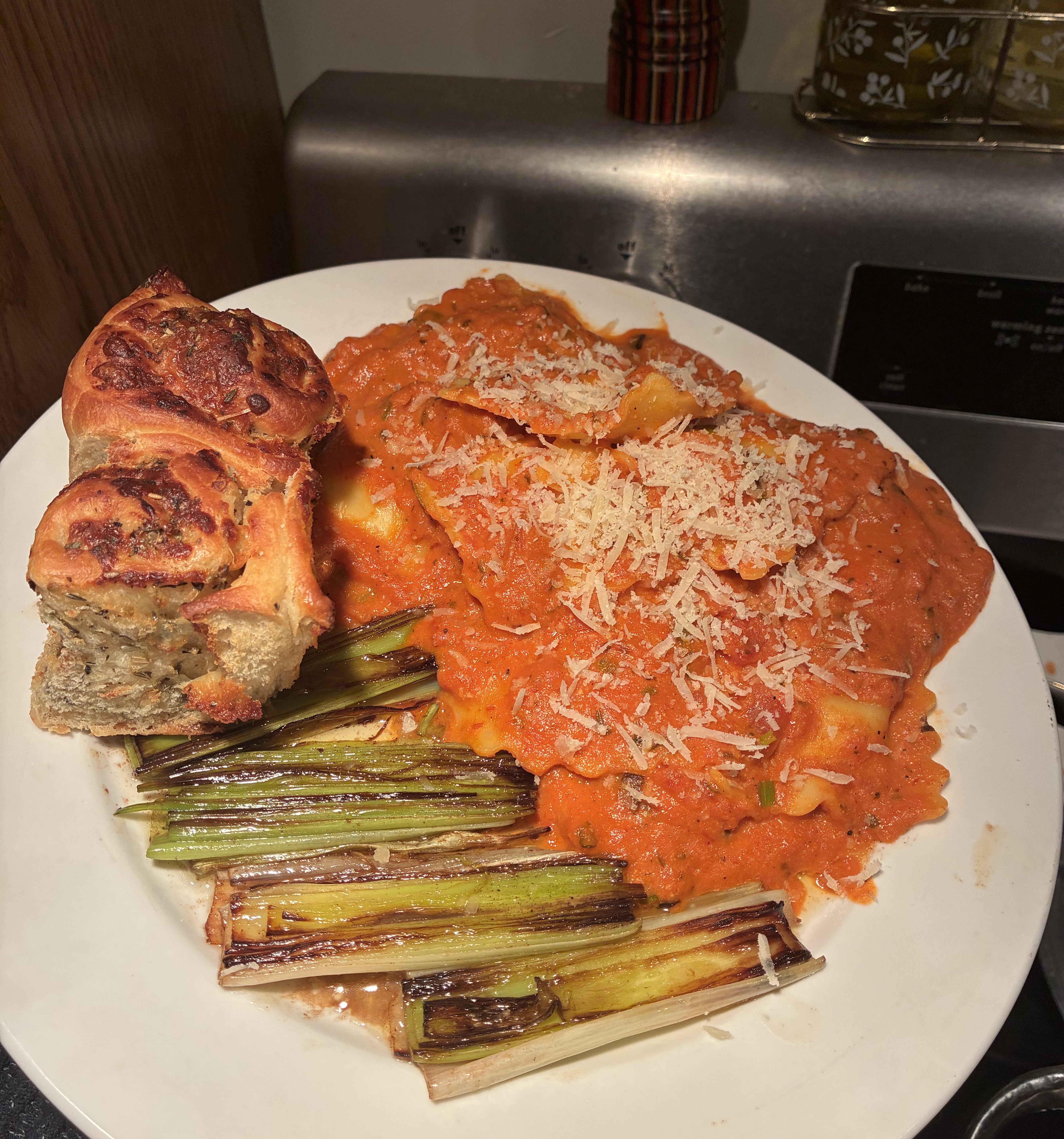 Cheese ravioli with leeks and garlic parmesan rolls