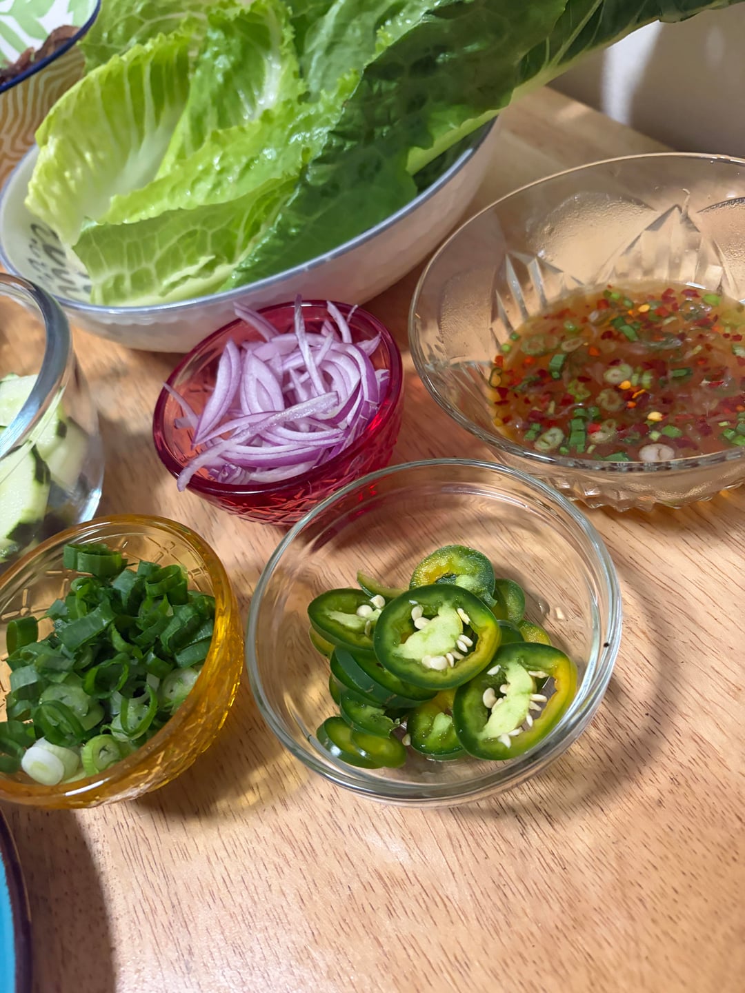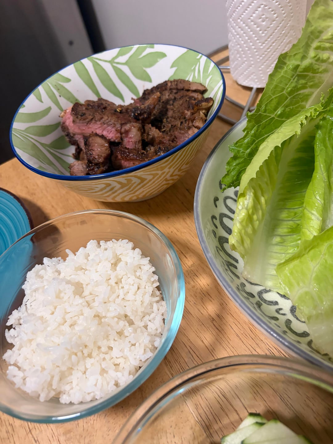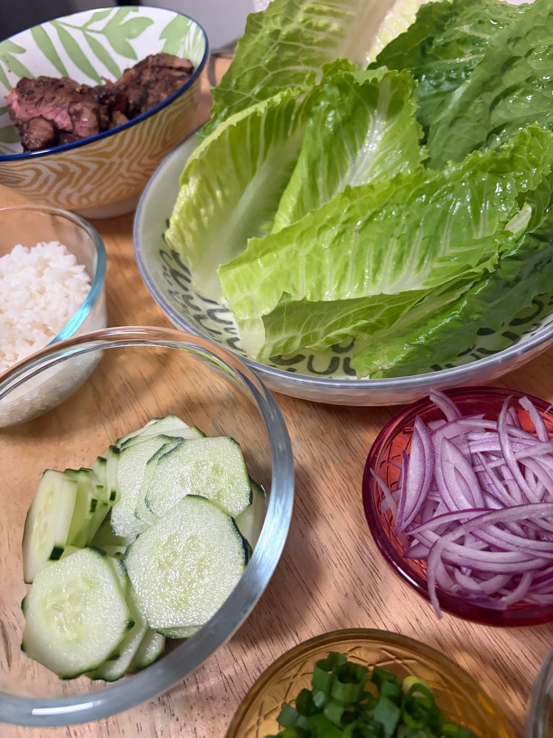 Another Lettuce Wrap Night! Steak, Romaine, Cucumbers, Red Onion, Jalapeño, Scallion, Jasmine Rice & Jeow Som inspired dipping sauce (Lao) by Friendly-Try578 Dinner Tonight Tonight's Dinner