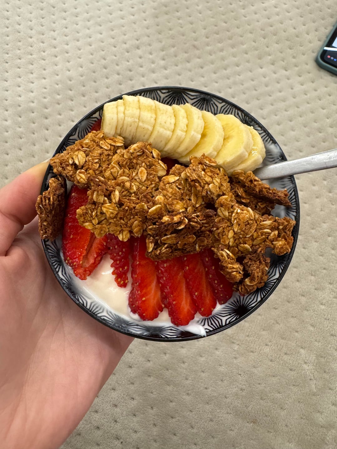 To a bowl add the dry ingredients then mix in the wet ingredients. Lay the mixture flat on a parchment paper (press it down) and bake in the oven for 30 mins at 160 degrees Celsius