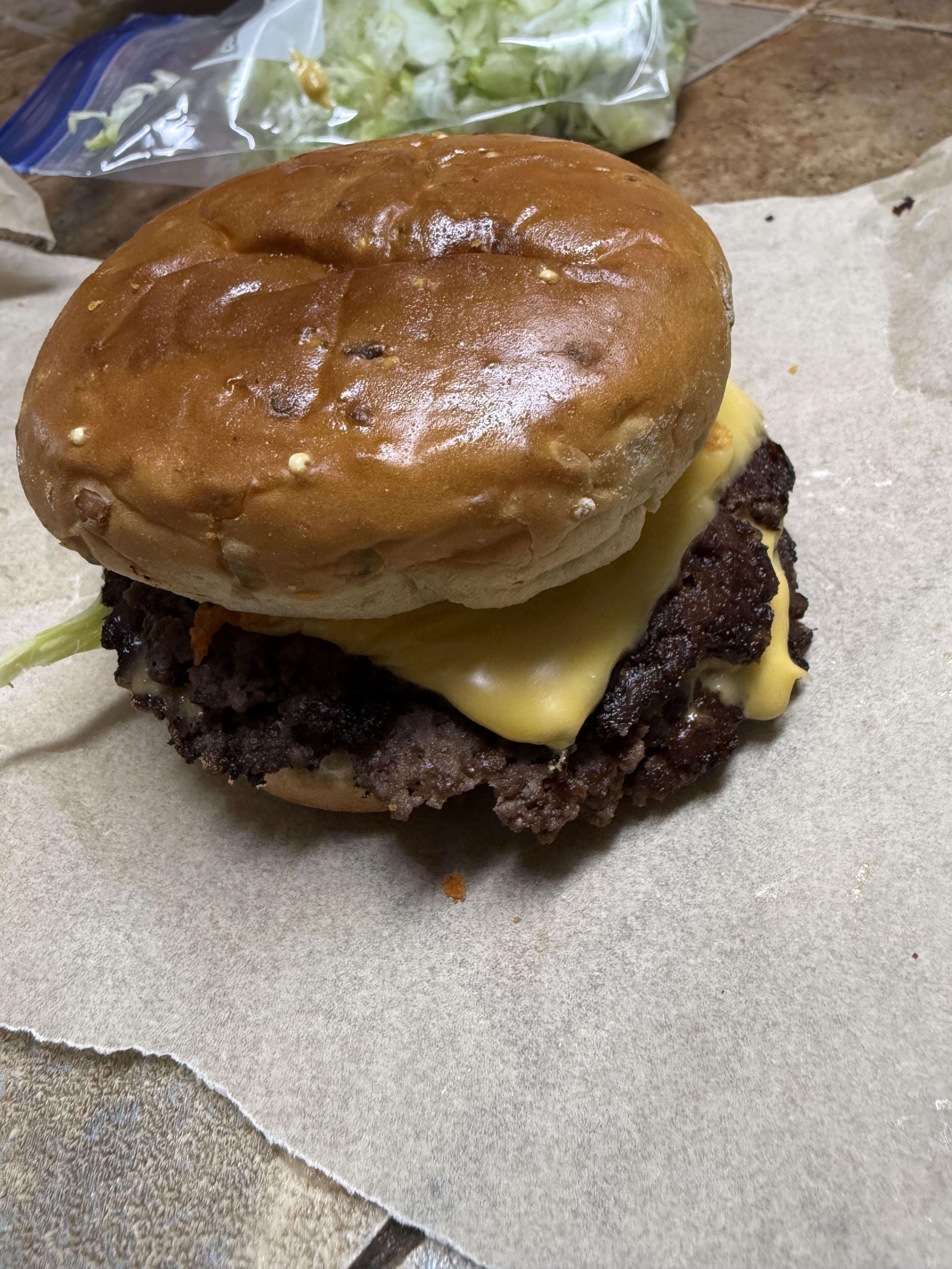4oz 90/10 ground beef (diving into do balls and smash them on high heat for a minute and add salt and pepper. and flip and then add velveta cheese (35 cals 3g protein) You can use 80/20 ground beef, just add 90 cals sub 4g protein, still good macros and taste better).