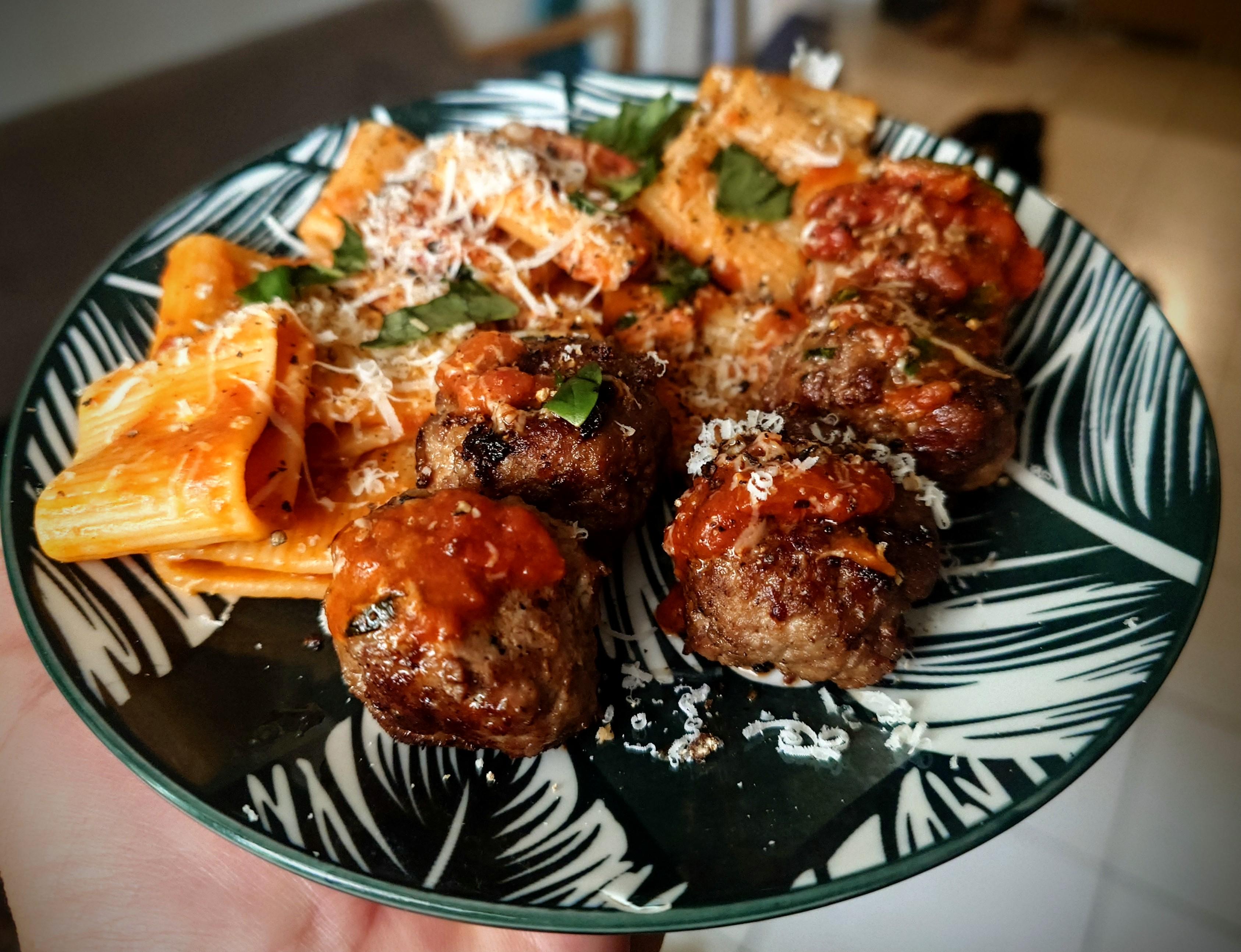Paccheri with meatballs.