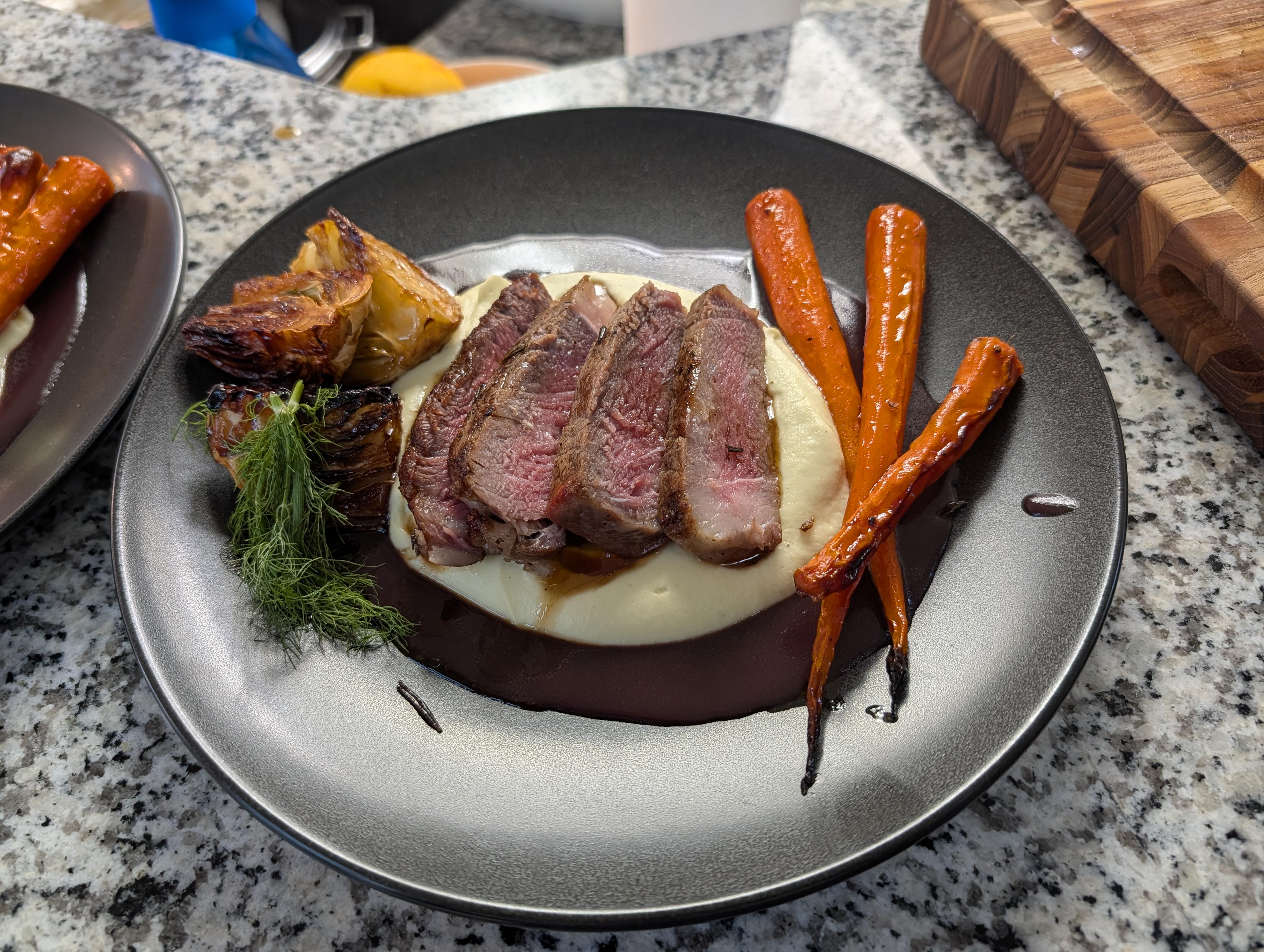 Reverse seared ribeye steak over parsnip puree and a bordelaise sauce. Glazed carrots and fennel on the side. by shphunk Food Porn