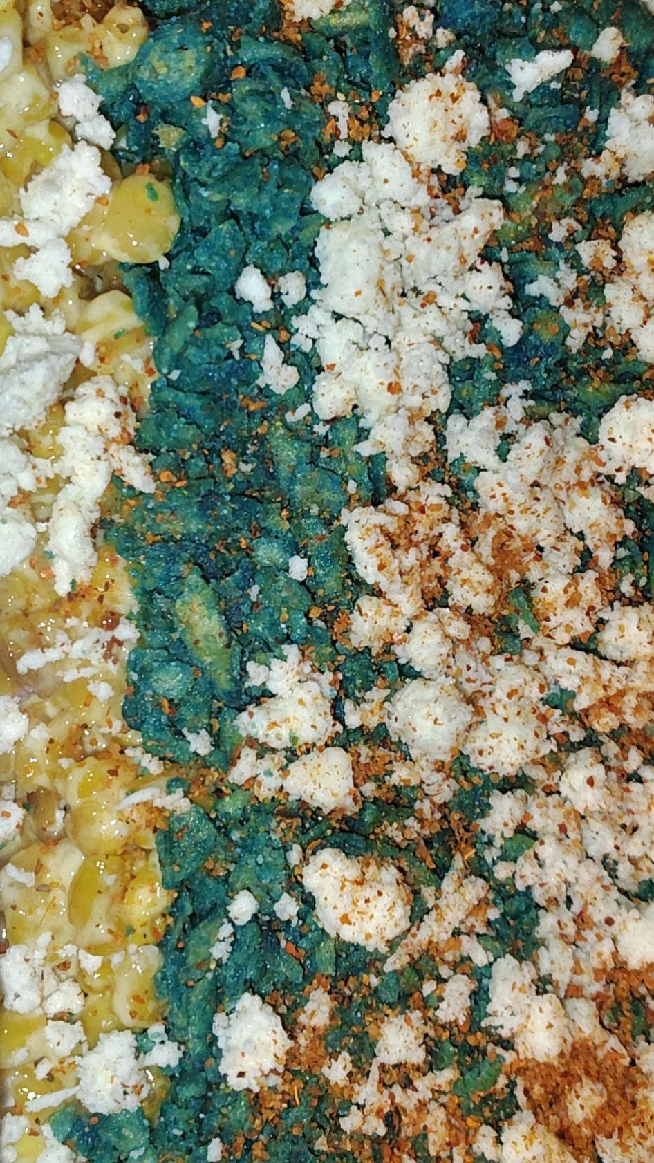 toasted up three cans of corn with butter and then instead of using kewpie mayo instead of classic Mayo then I crumbled blue takis over it and cojtia and tajin and lime juice