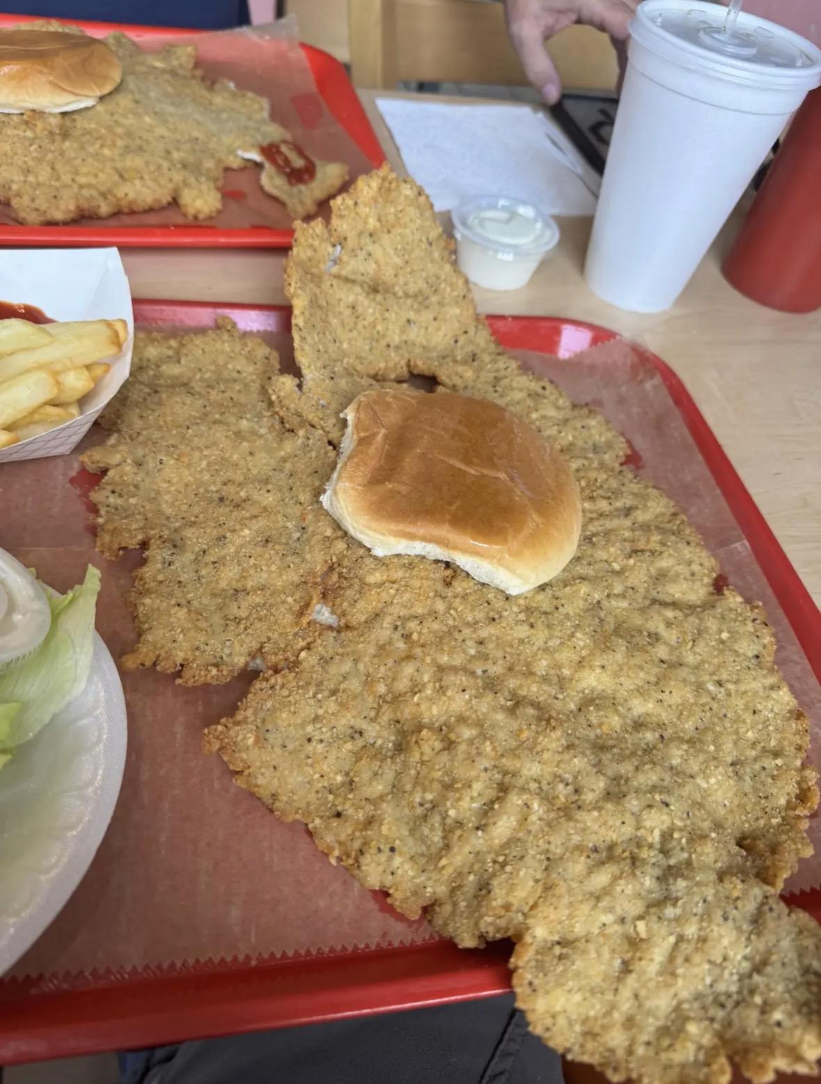 11. I was in Indiana last year and had to try one of the large pork tenderloin sandwiches. The one I had was big, but not this big. It certainly wasn’t hanging over the table and touching the tray which seems kind of gross.