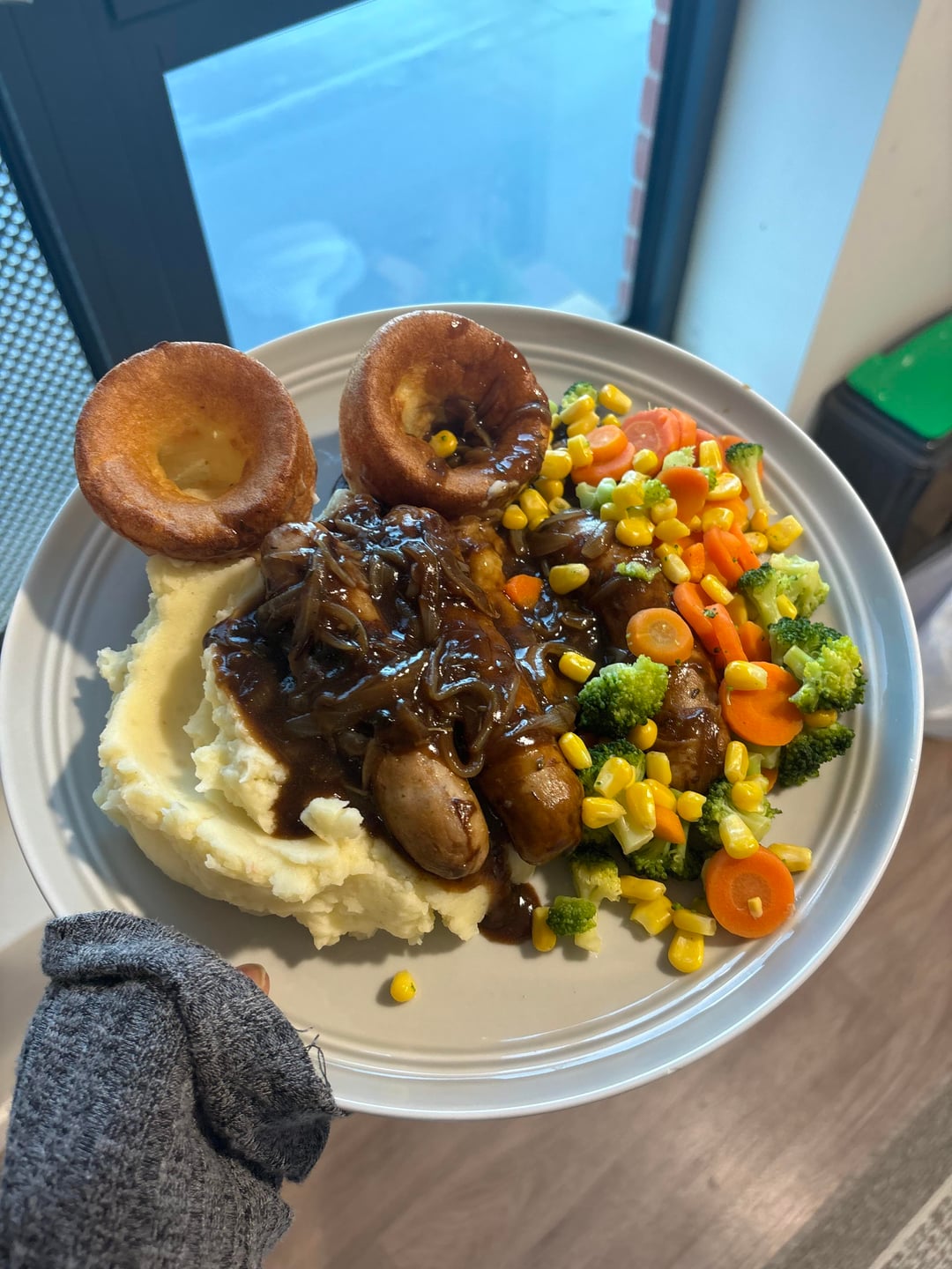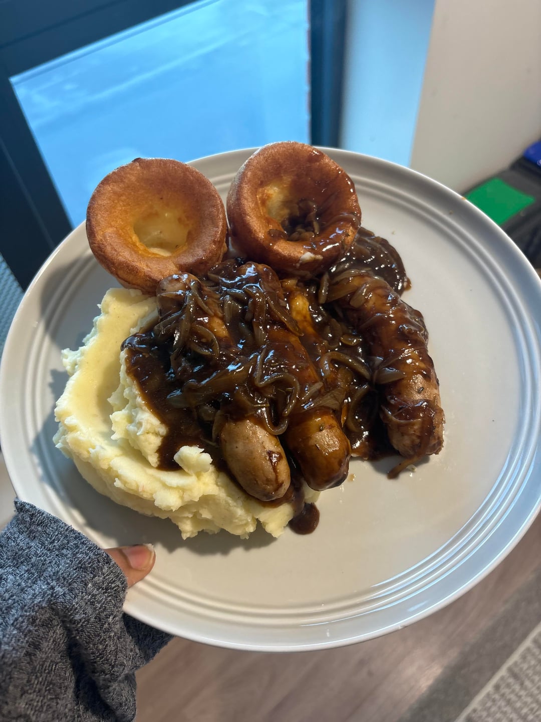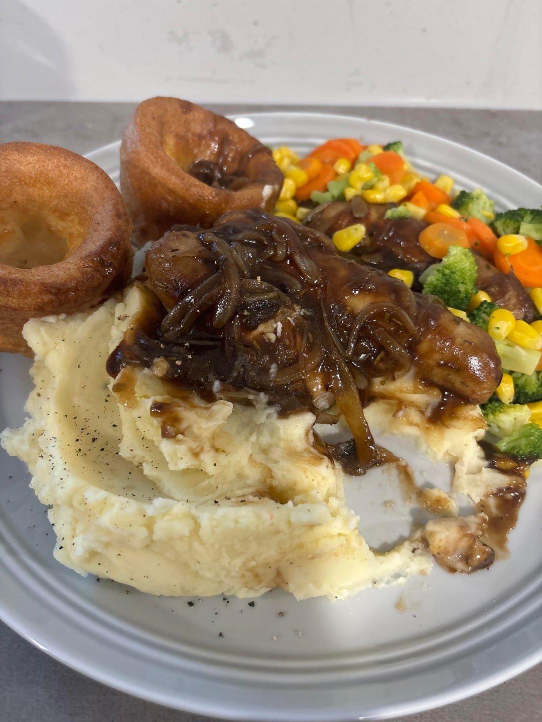 Mash, onion gravy, sausages and Yorkshire pudds :]