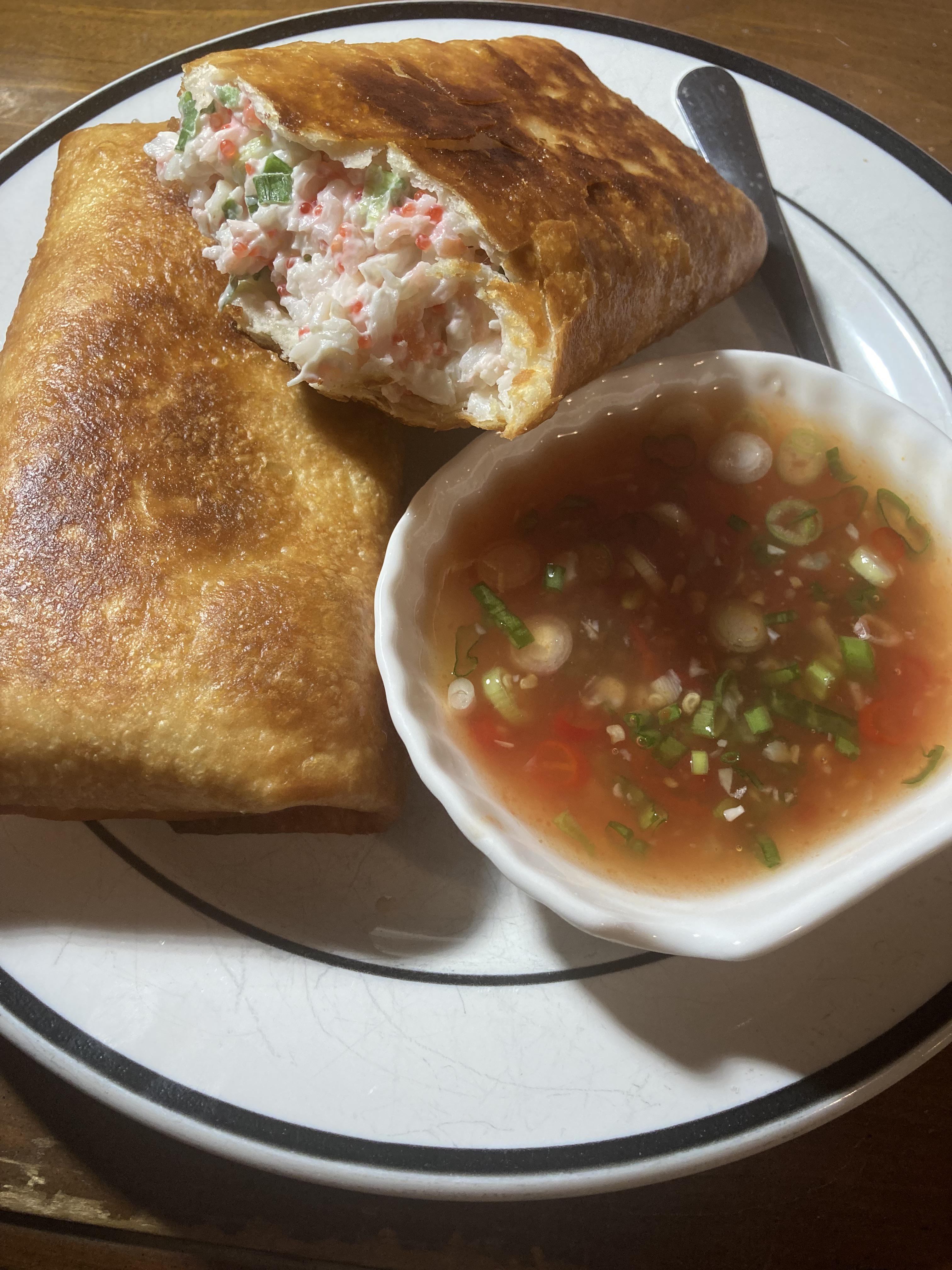 3. That looks like crab salad to my eyes, and though I know it’s not, my brain is confused with the “should be cold” crab salad wrapped in the “Very hot outta the fryer” burrito wrapping.