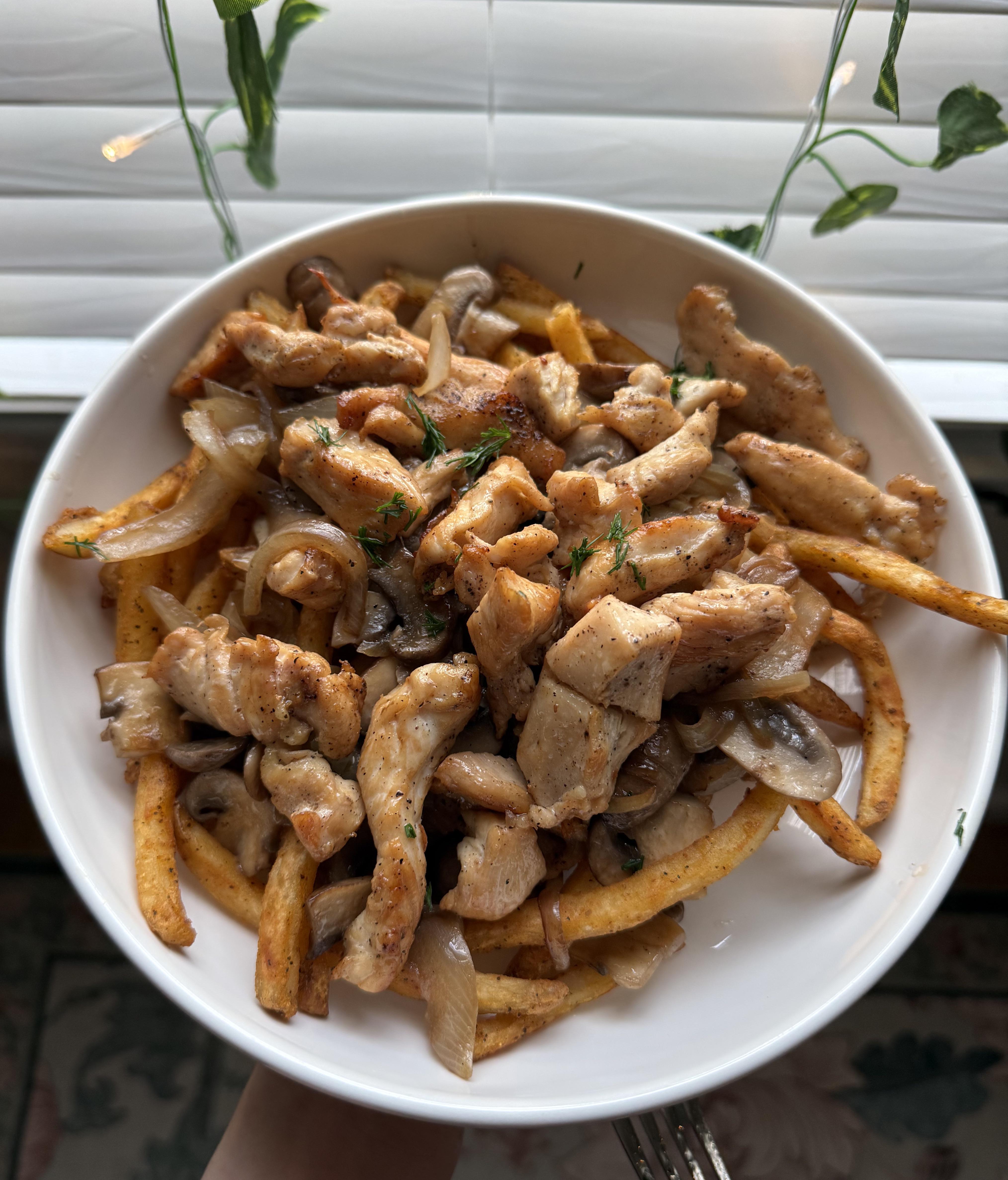 emmafilet on April 15, 2026 11:13 pm with chicken, mushrooms, & onions and a side of tzatziki 😄 this is my fav dish from a russian restaurant i go to, so i thought i’d try it at home & i love mine even more!!