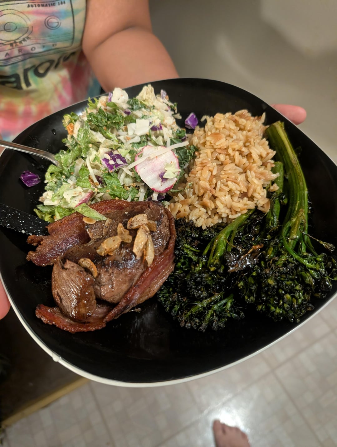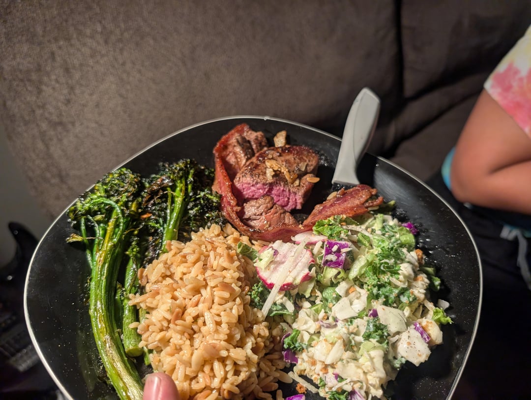 Finally tried those $5 bacon-wrapped filets. Not great, but not terrible. Served with broccolini, rice pilaf, and dill-pickle-themed chopped salad mix.