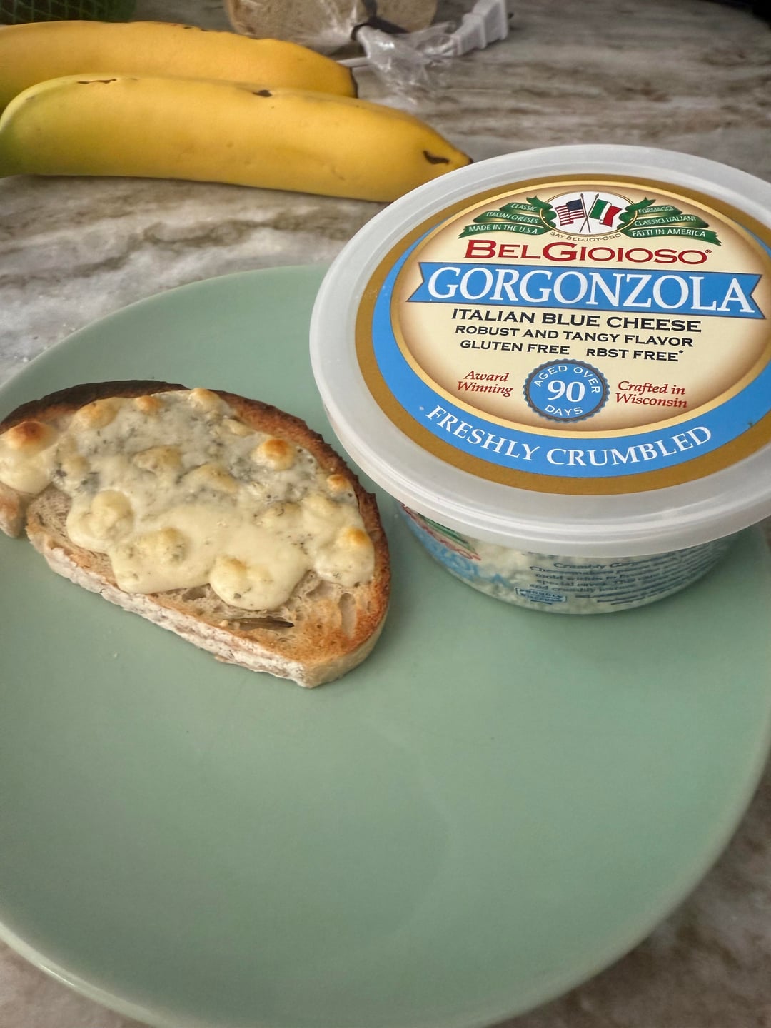 Aged over 90 days, this is a STRONG blue cheese. Melts down nicely to a 50/50 crumbly and creamy texture. This was a taste of Italy in every bite. I burnt the toast a little bit trying to pull out some caramelization coloring but it was divine regardless. This cheese is aged for 90 days as opposed to 60 days for regular blue cheese which gives its deep and robust flavor and aroma. It is indeed, delicious. Huge fan.