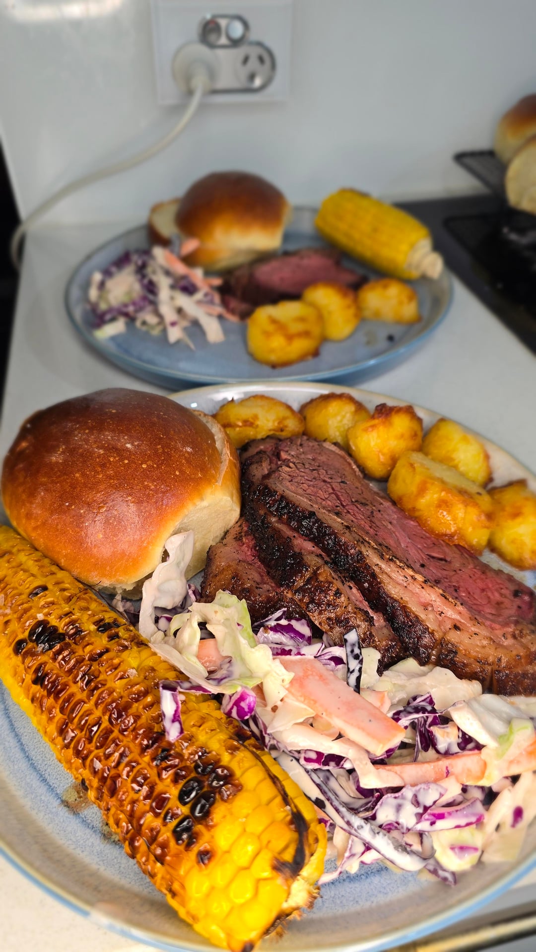 Smoked picanha, wood fired corn, crunchy duck-fat potatoes, home made rolls and ‘slaw by naikii Dinner Tonight Tonight's Dinner