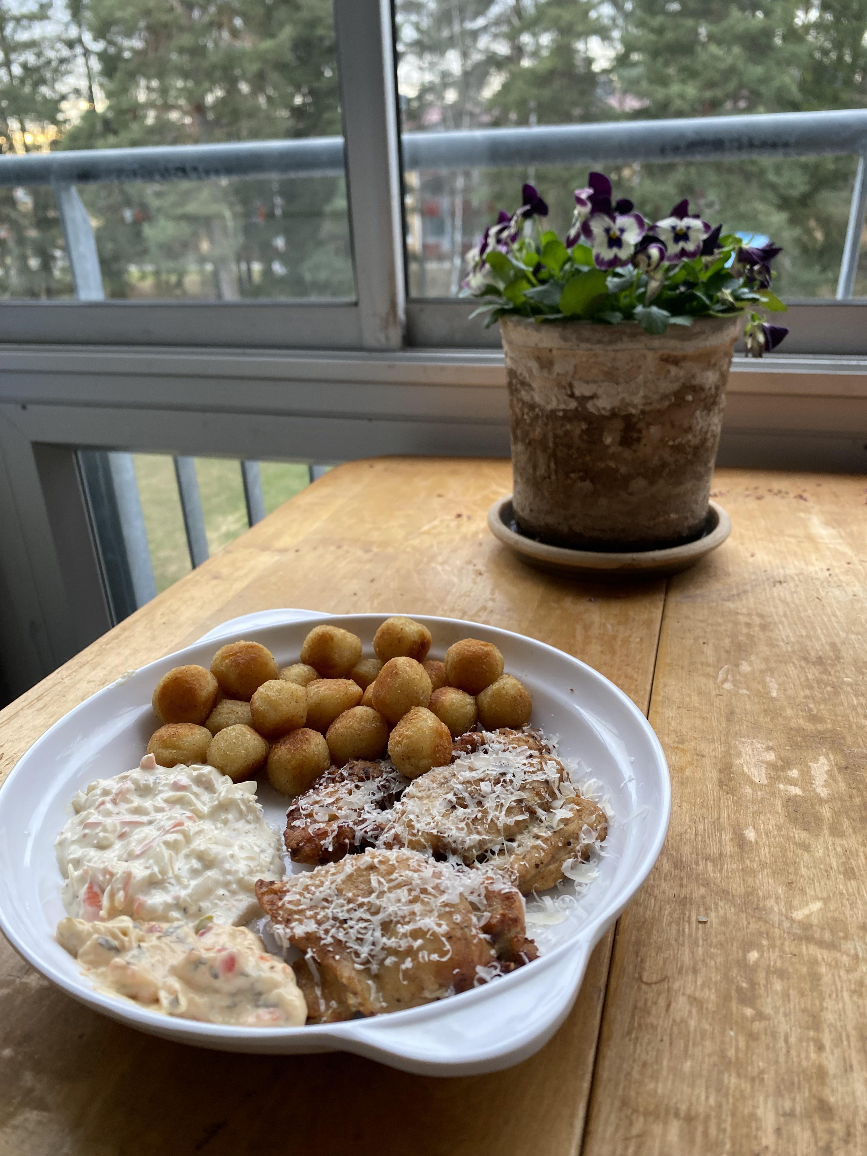 Spicy air fried fillets long with buttered potato balls and coleslaw. by warql Dinner Tonight Tonight's Dinner