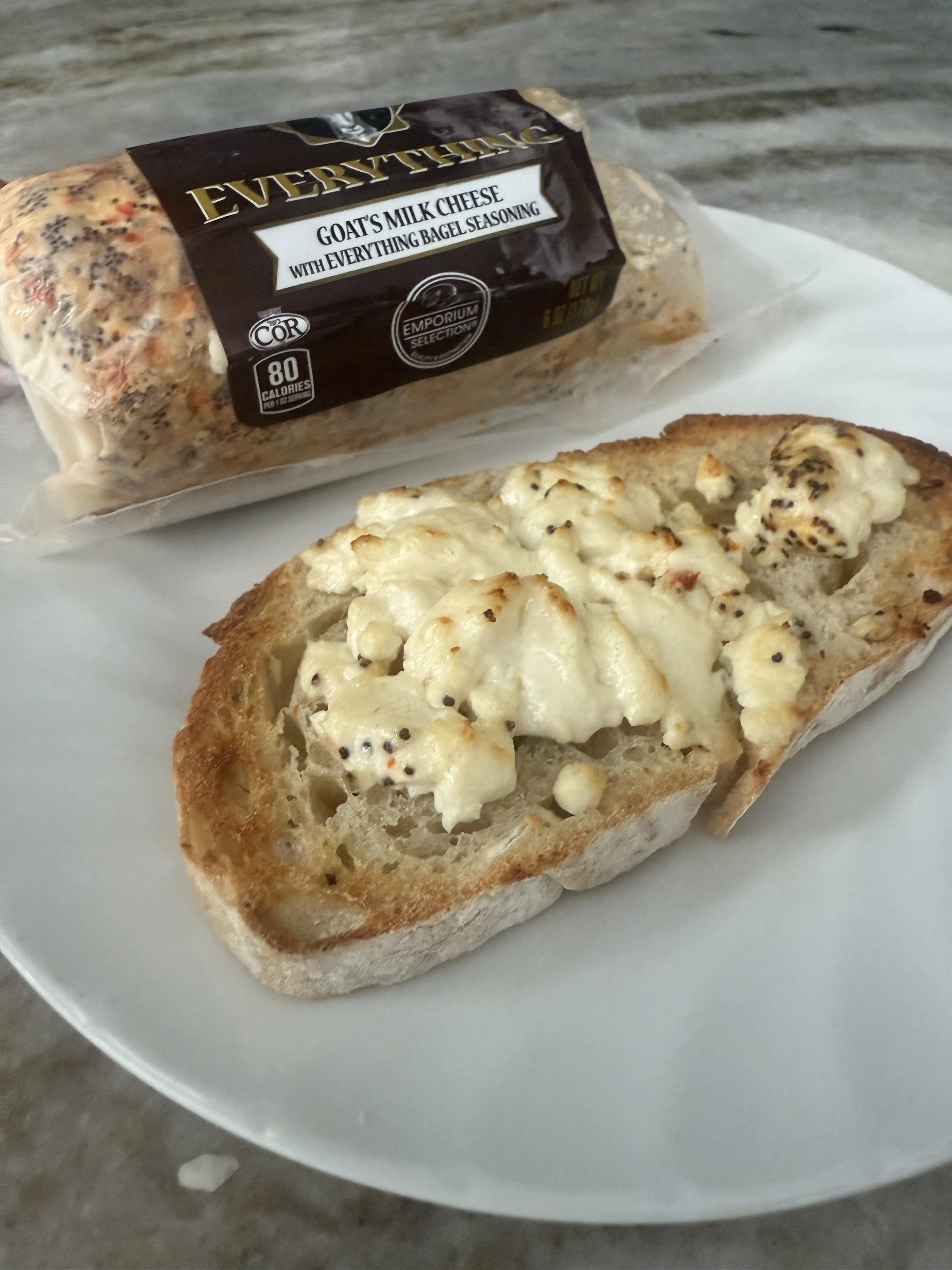 I love goat cheese on pizza but still wasn’t entirely sure how it’d react to toasting. This goat cheese caramelized lightly on top while retaining the creamy texture that goat cheese is renowned for, the creamy texture pops lightly off the crunchy toast. The flavor of the everything seasoning was mostly lost along the way of the toasting. I’m a huge fan of goat cheese and it pairs great on toast.