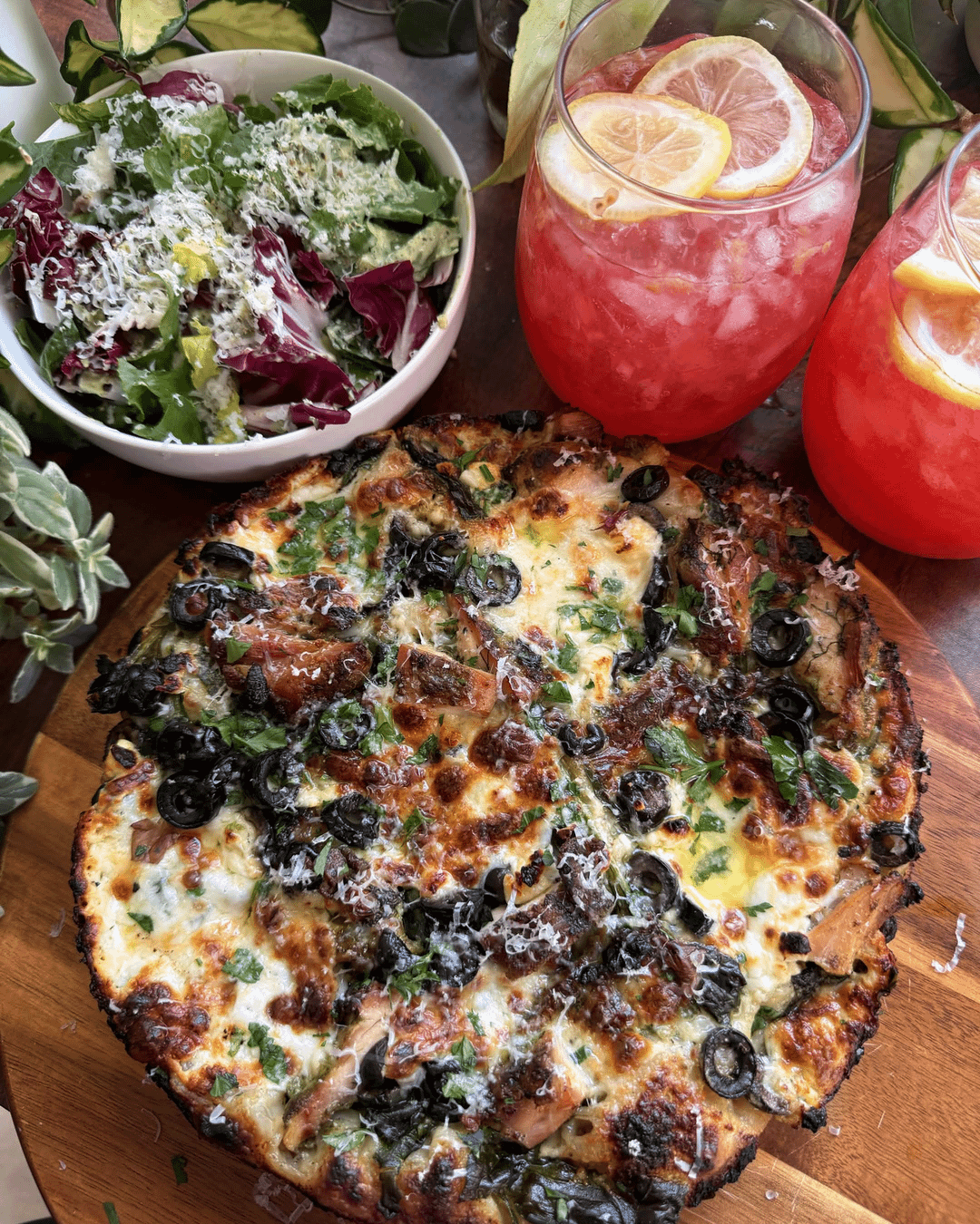 * Sourdough pan pizza dough, roasted garlic alfredo sauce, spinach, grilled chicken, black olives, scallions, mozzarella, provolone, asiago, and parmesan. Plus caesar salad and raspberry lemonade.