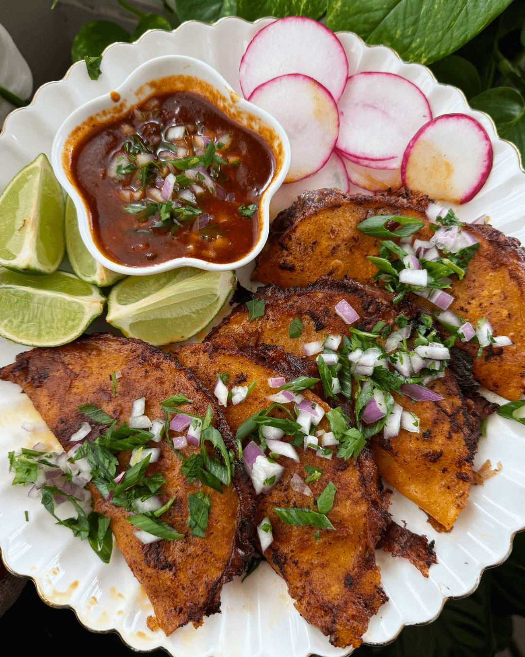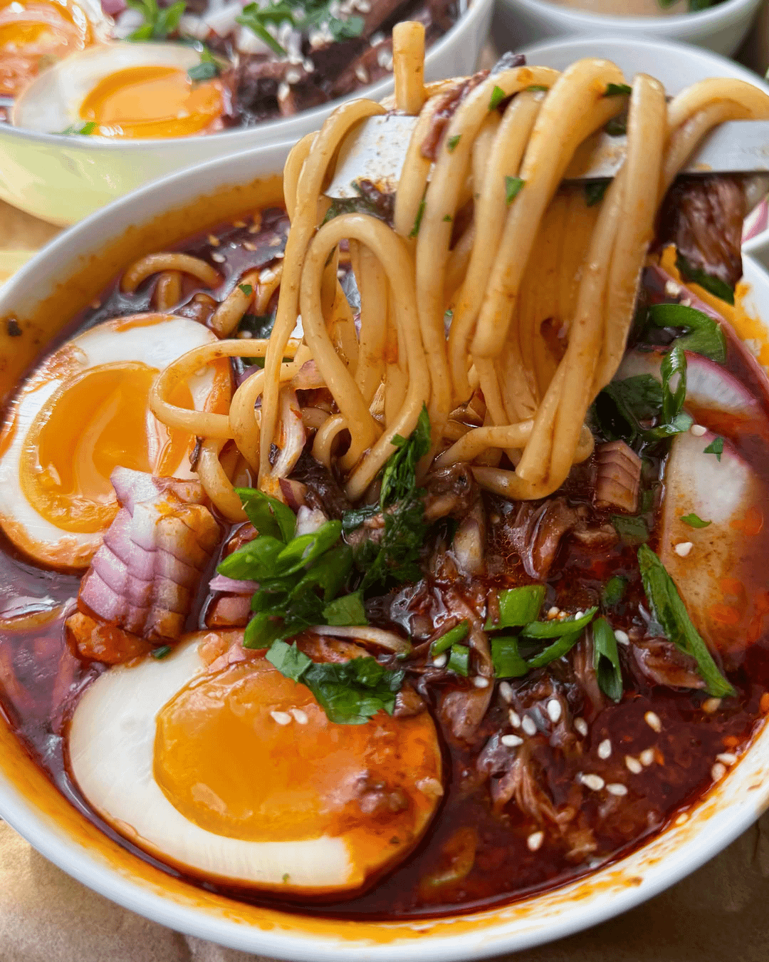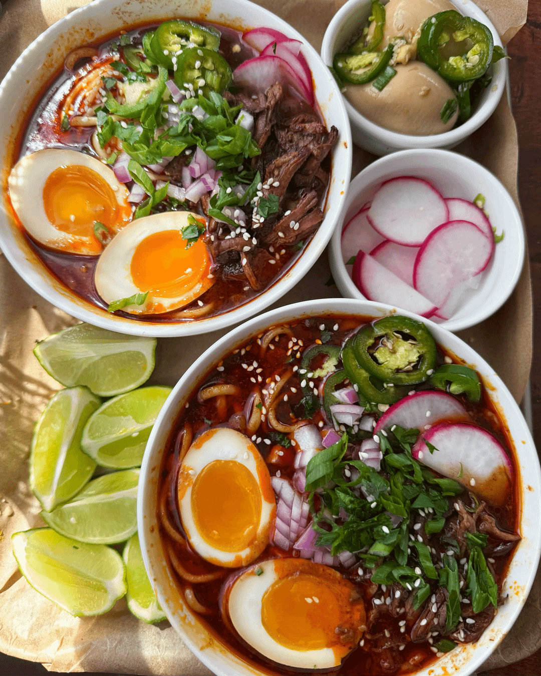 * Birria ramen with udon noodles, marinated eggs, radishes, limes, jalapeno, onion