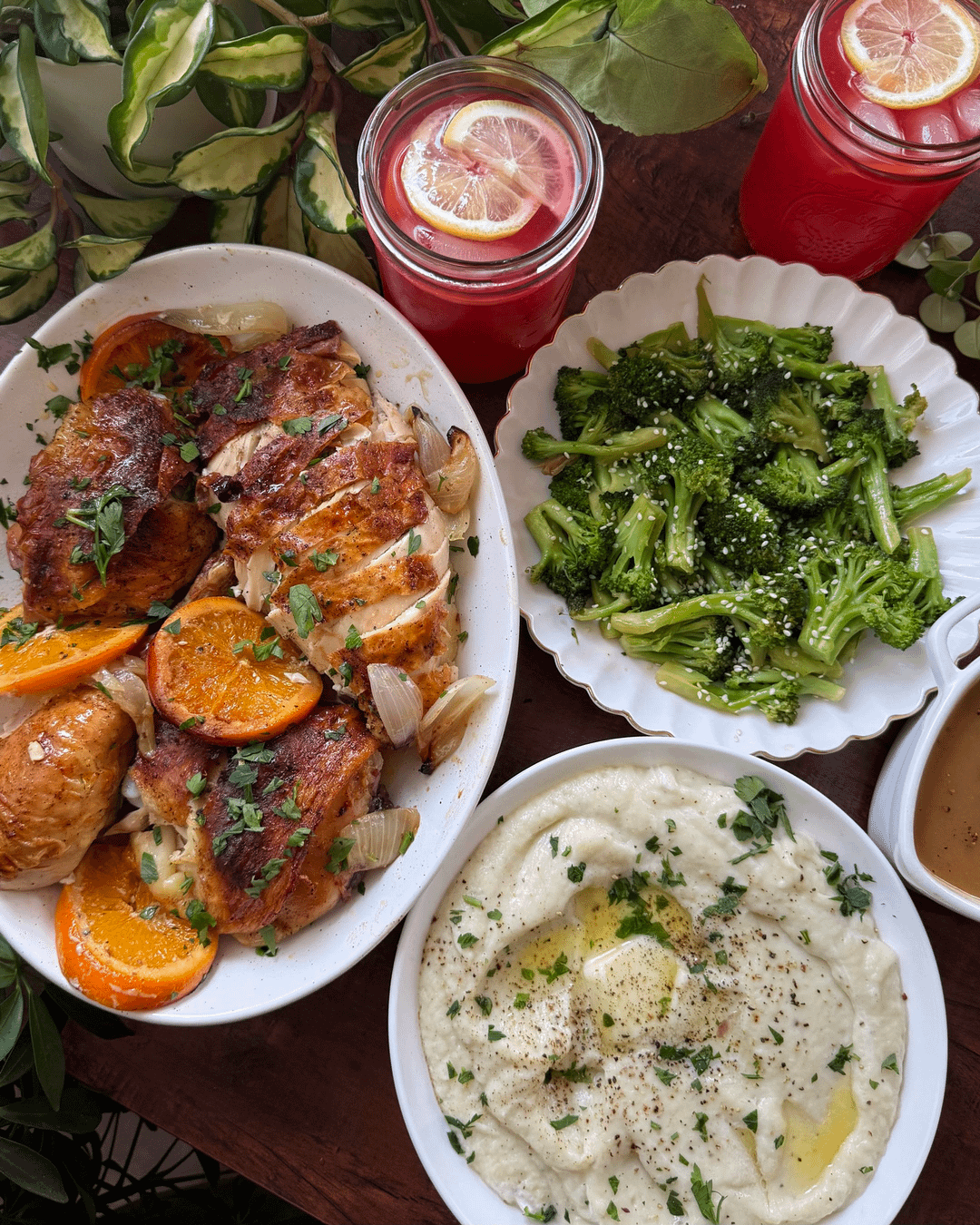 * Orange thyme spatchcock chicken, broccoli, and roasted garlic cauliflower mash + gravy