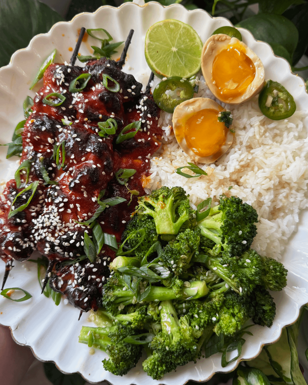 * Gochujang chicken skewers, garlicky broccoli, jasmine rice, and marinated eggs (with some of the marinate drizzled over the rice)