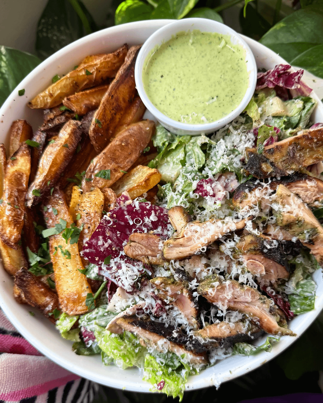 * Grilled chicken Caesar salad w/ oven baked fries + green goddess dressing on the side