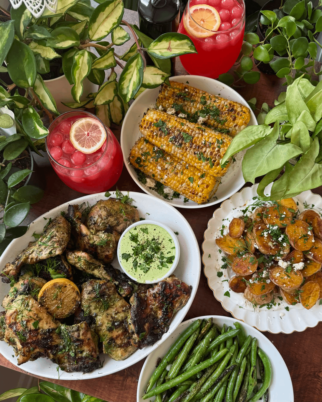 * Grilled chicken thighs, grilled corn, roasted potatoes on top of whipped feta, charred green beans and raspberry lemonade
