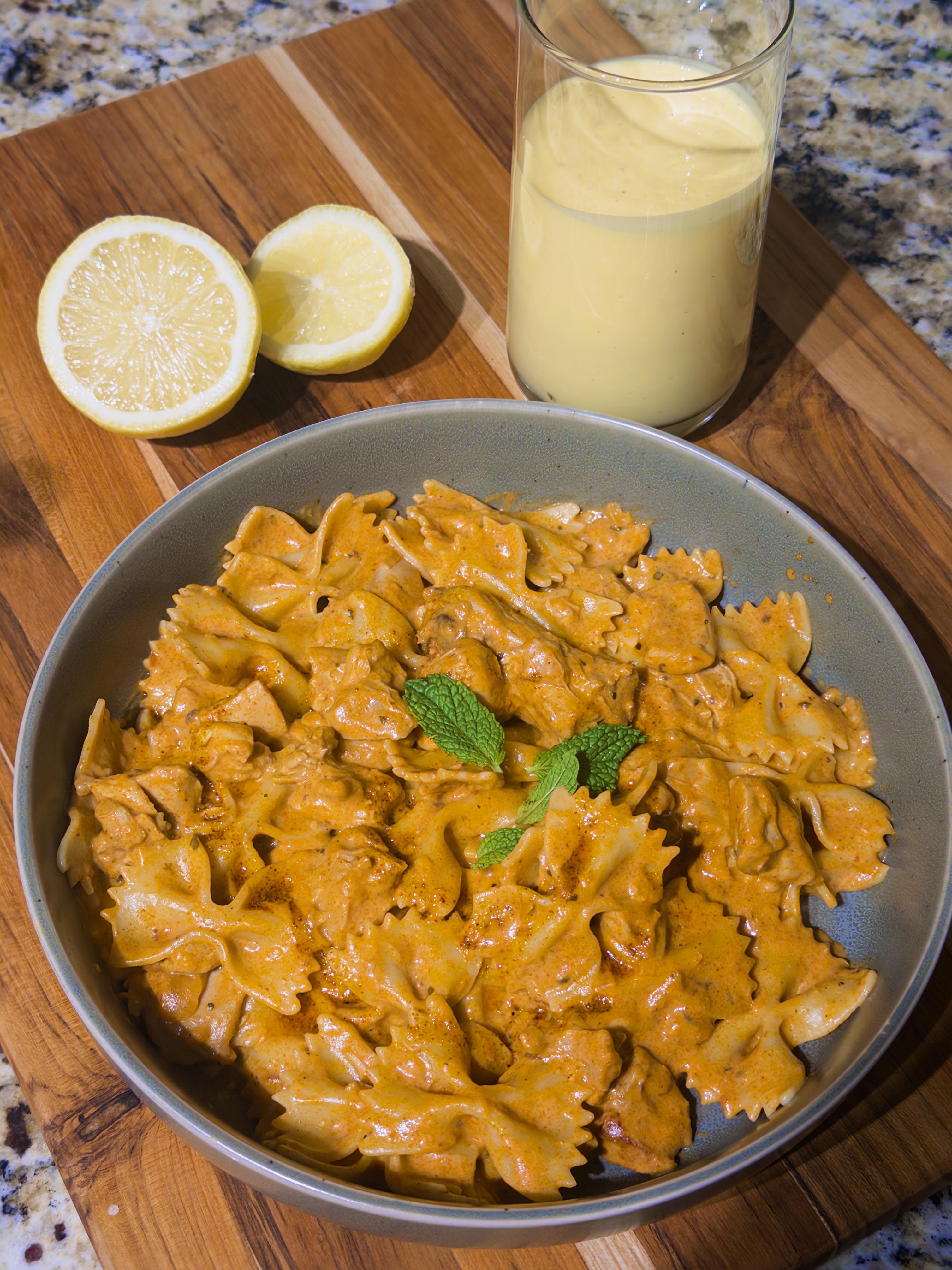 Chicken tikka masala pasta w mango lassi 🙂