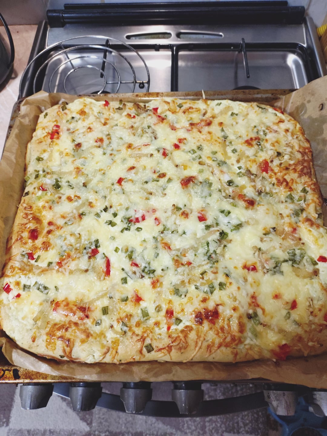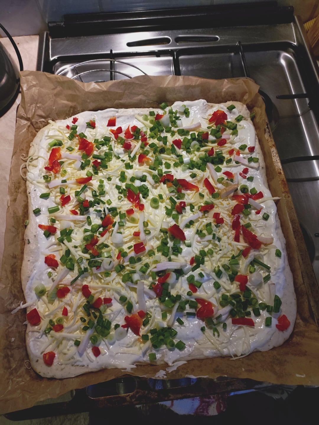 Sour cream "lagngalló" is a Hungarian specialty. They put sour cream, bacon, and red onion on bread dough. Then they bake it in a 200 °C oven or in a furnace. I made it with sour cream, green onion, smoked bacon, and California peppers, and sprinkled with cheese.