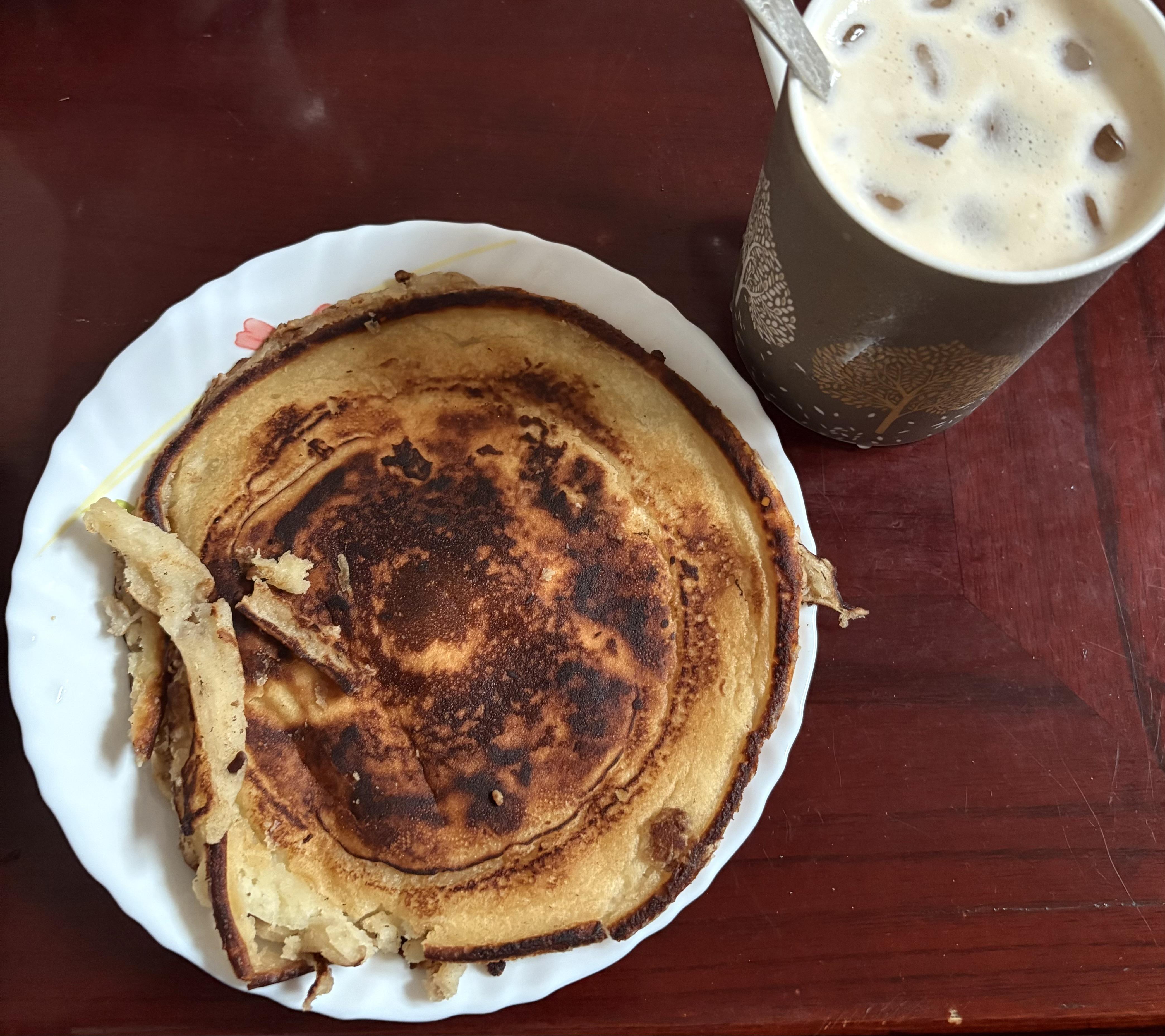 It seems like you cooked it in high temperature 🙃. Cook with lower temperature so you have enough time to flip it and not burn the pancake. Also try to spread it little thicker.