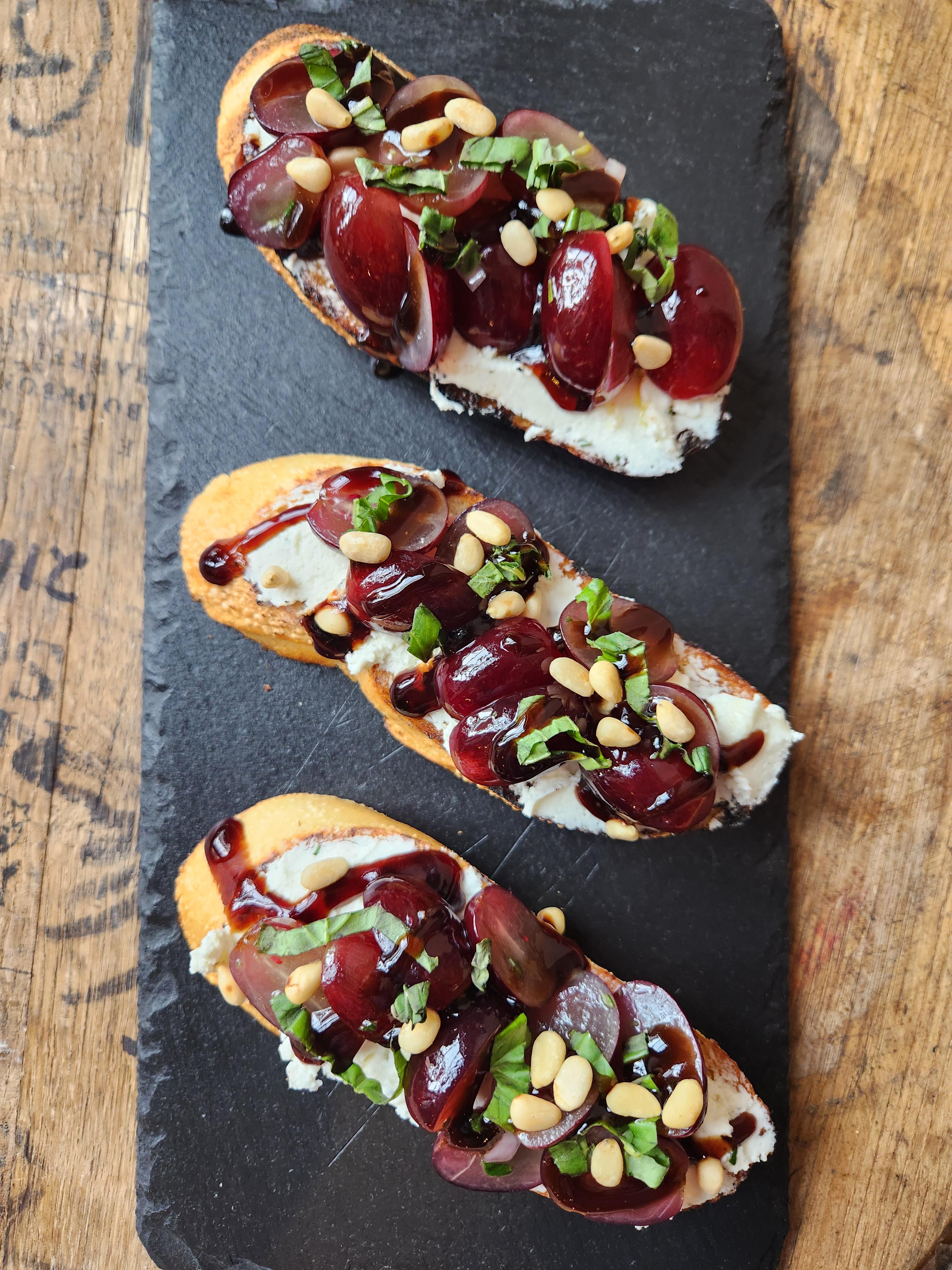 Red grape bruschetta, mascarpone cheese, toasted pine nuts, basil, balsamic glaze, grilled crostinis by Itz_me_JBO Food Porn