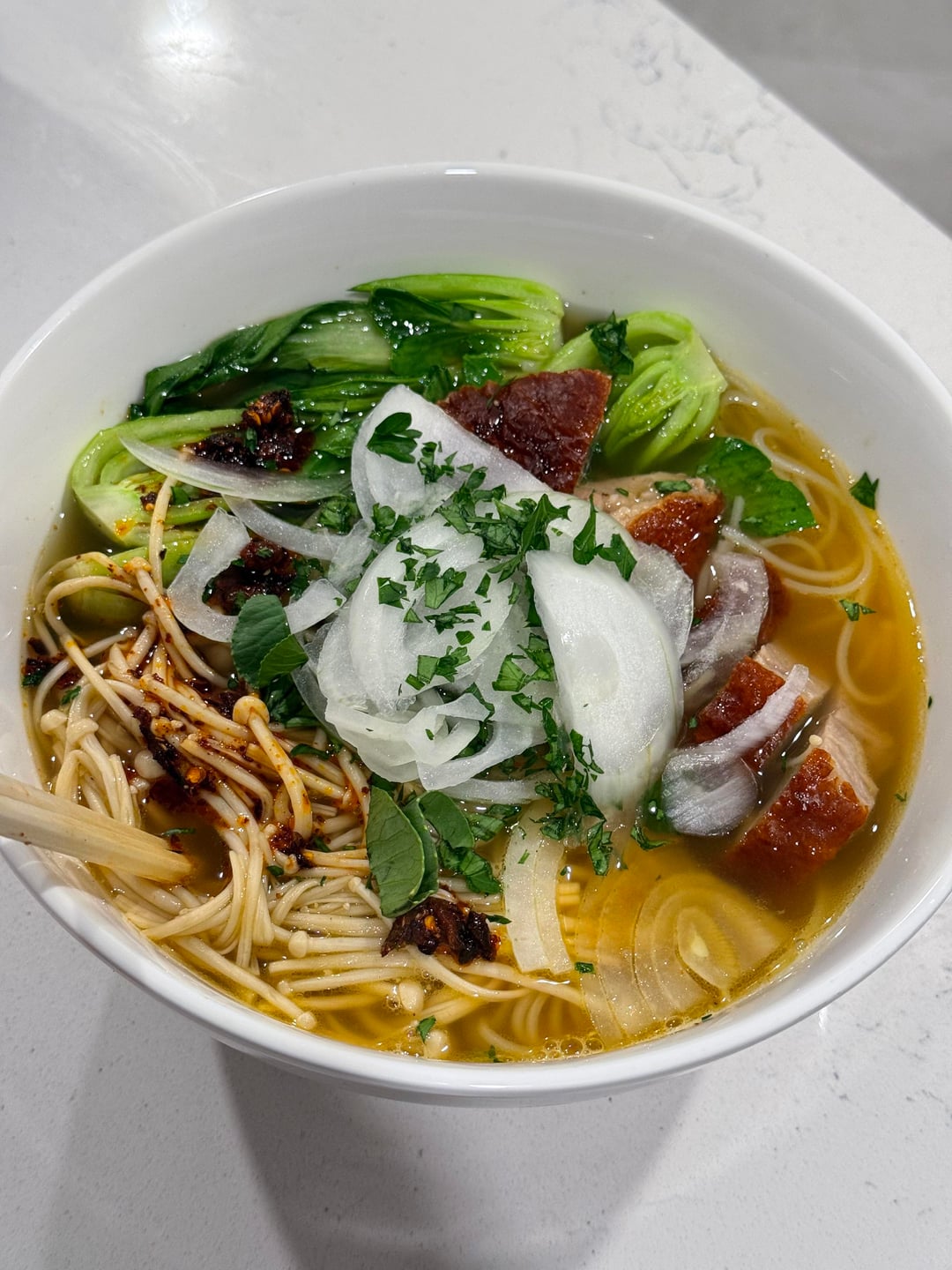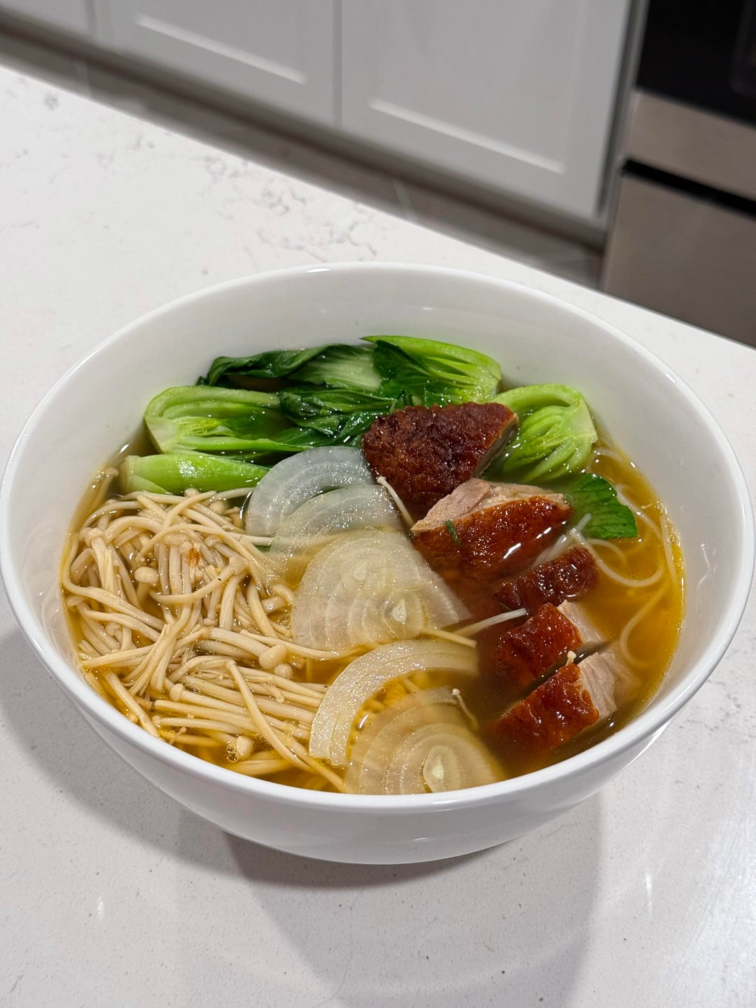 [homemade] duck rice noodle soup with enoki mushroom and baby bok choy