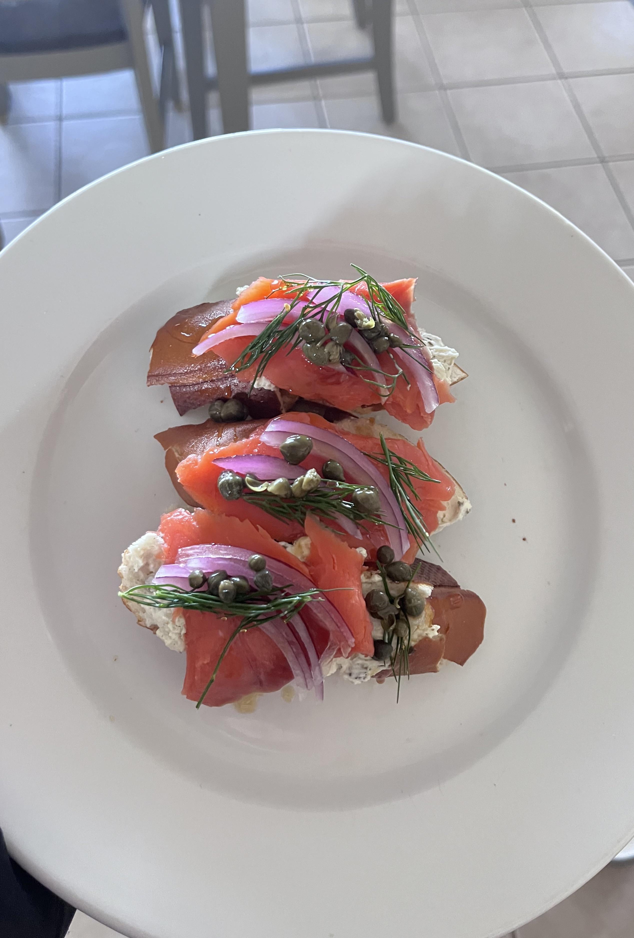 Snack (smoked salmon on baguette with capers, dill, red onions, spinach cream cheese and hot honey drizzled on top) by bbmm012 Food Porn