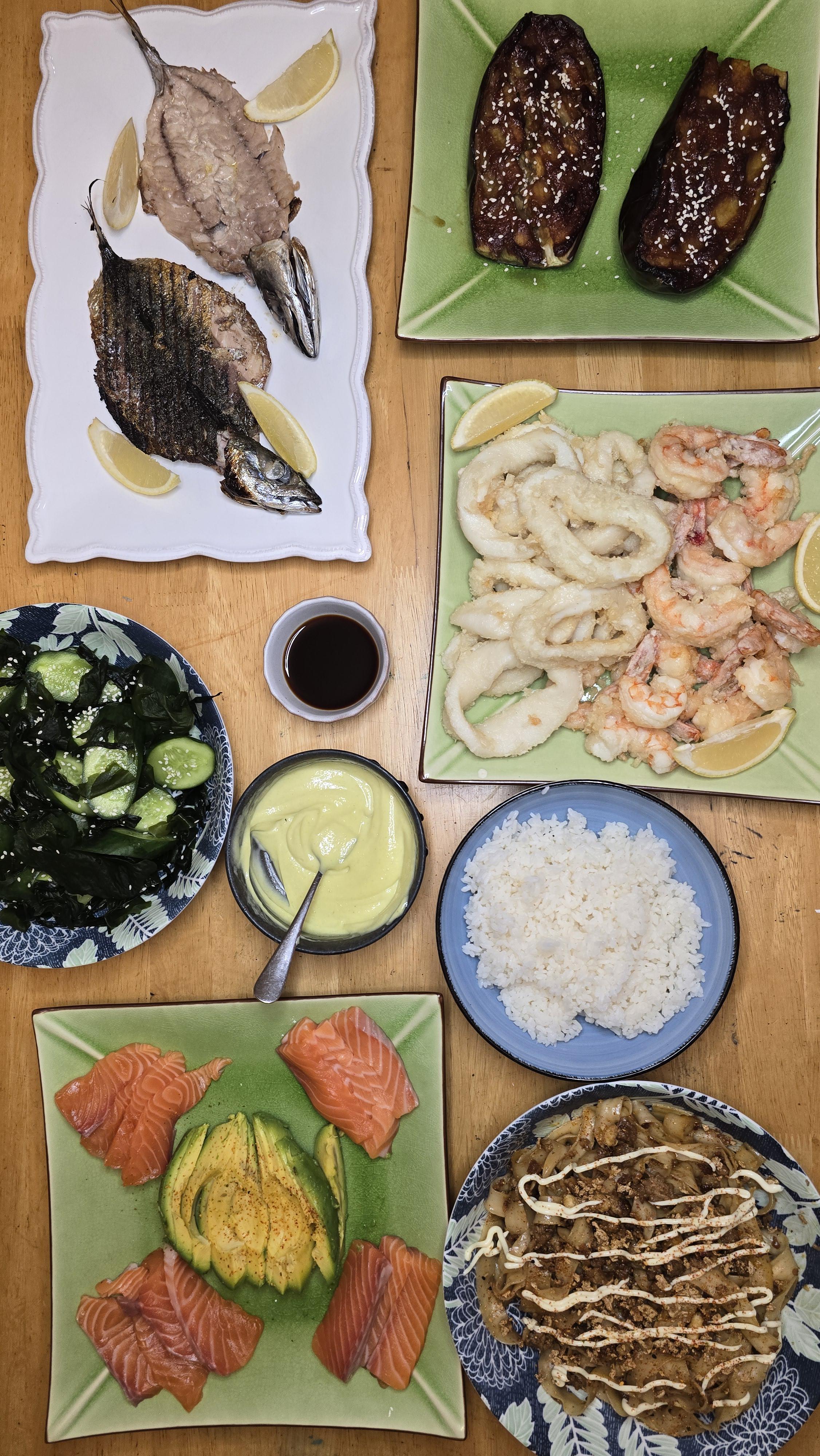 I did a Japanese themed tasting; woodfired saba shioyaki (grilled mackerel), sashimi, miso eggplant, tempura, garlic chilli pork and crispy tofu noodles and pickled cucumber and seaweed salad
