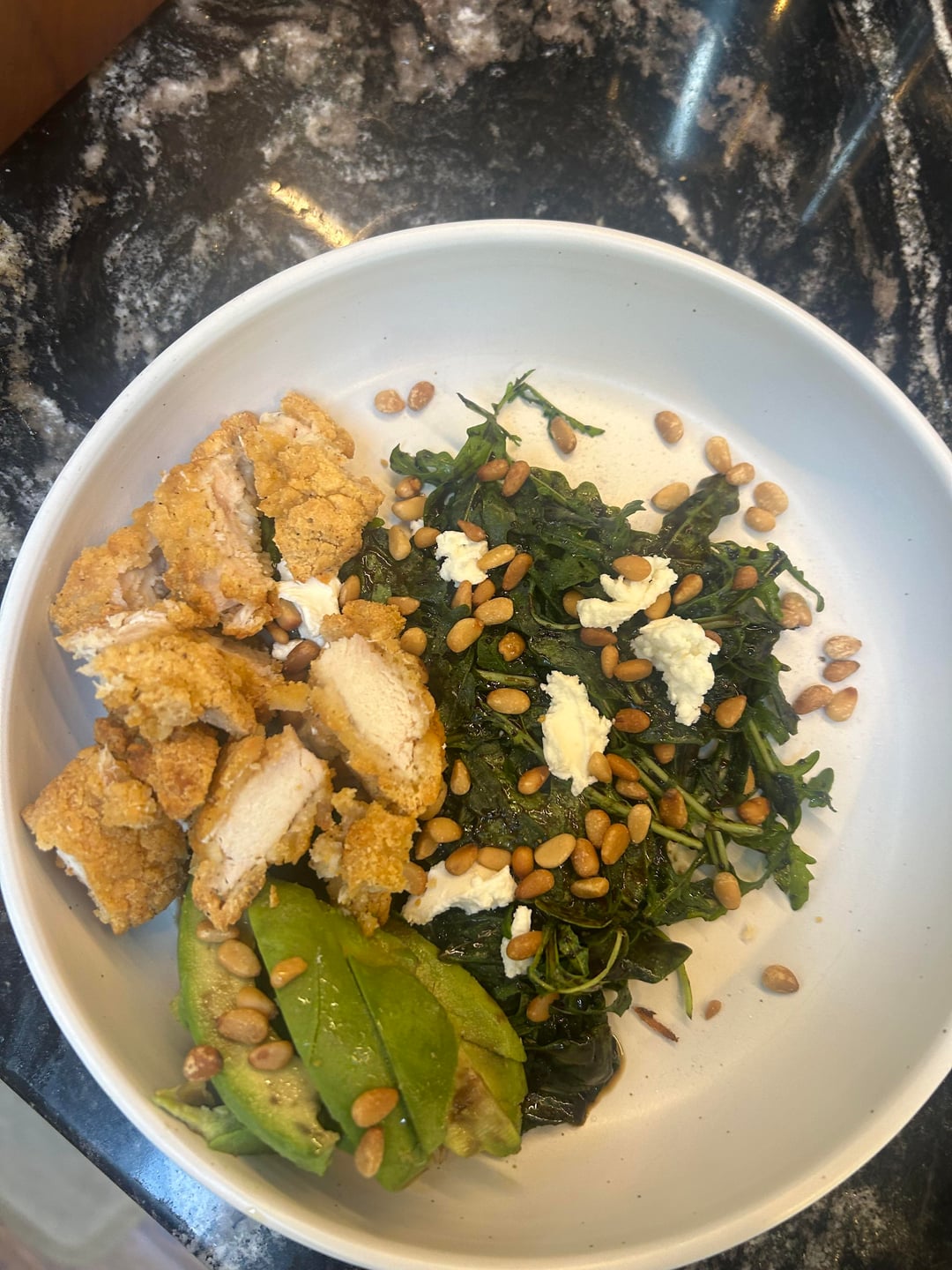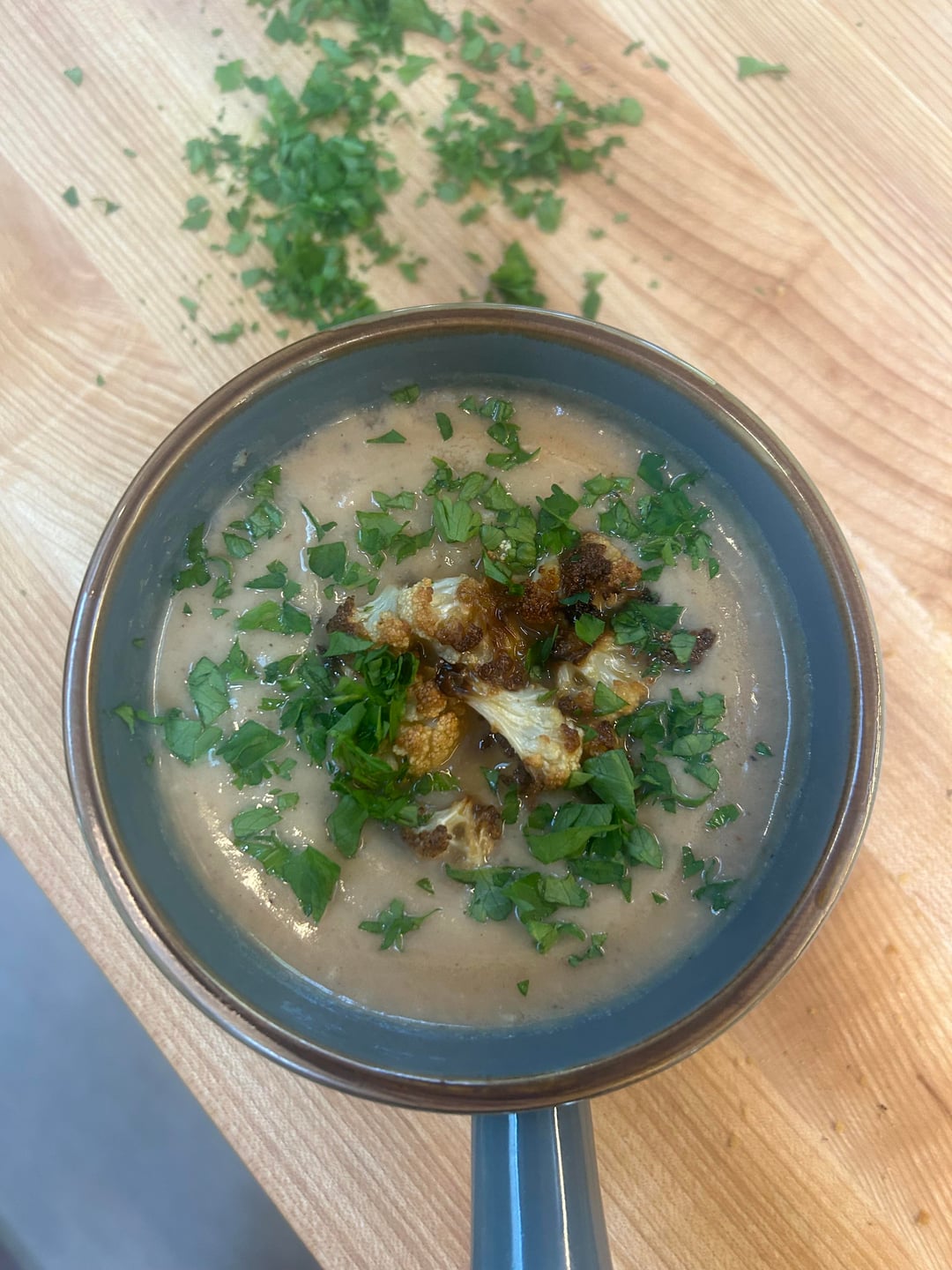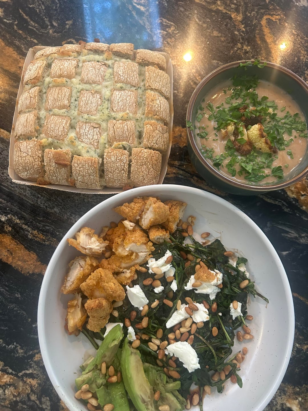 Roasted cauliflower soup, and arugula, goat cheese, roasted pine nut, and chicken strip salad. Costco bought cheesy pull apart bread. by Morticia_Devine Dinner Tonight Tonight's Dinner