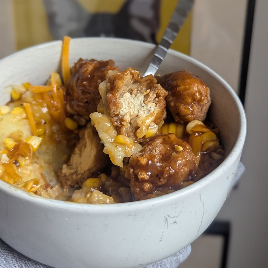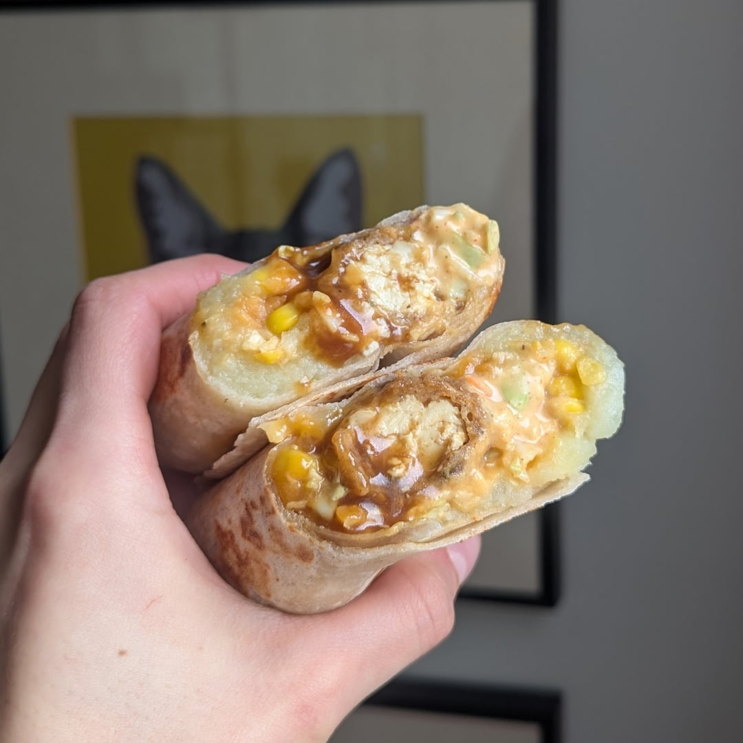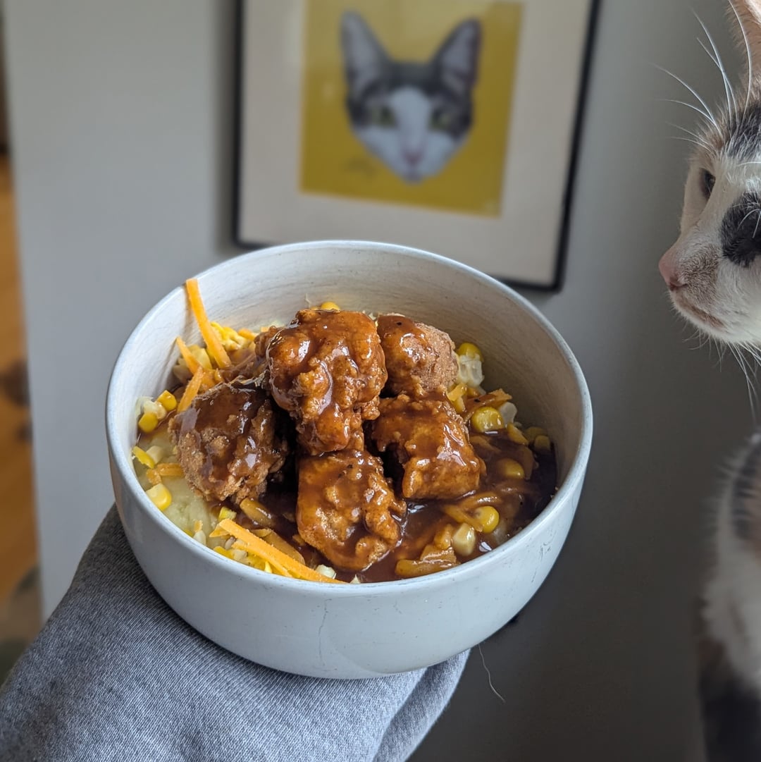 2. A classic bowl of sadness. Homemade mash, homemade gravy, fresh sweet corn, shredded inauthentic cheese product, and hand-breaded and deepfried soy boy bites. Same deal in the burrito but with Colonel’s Secret Slaw. 🫡