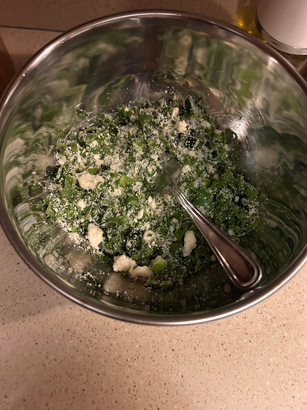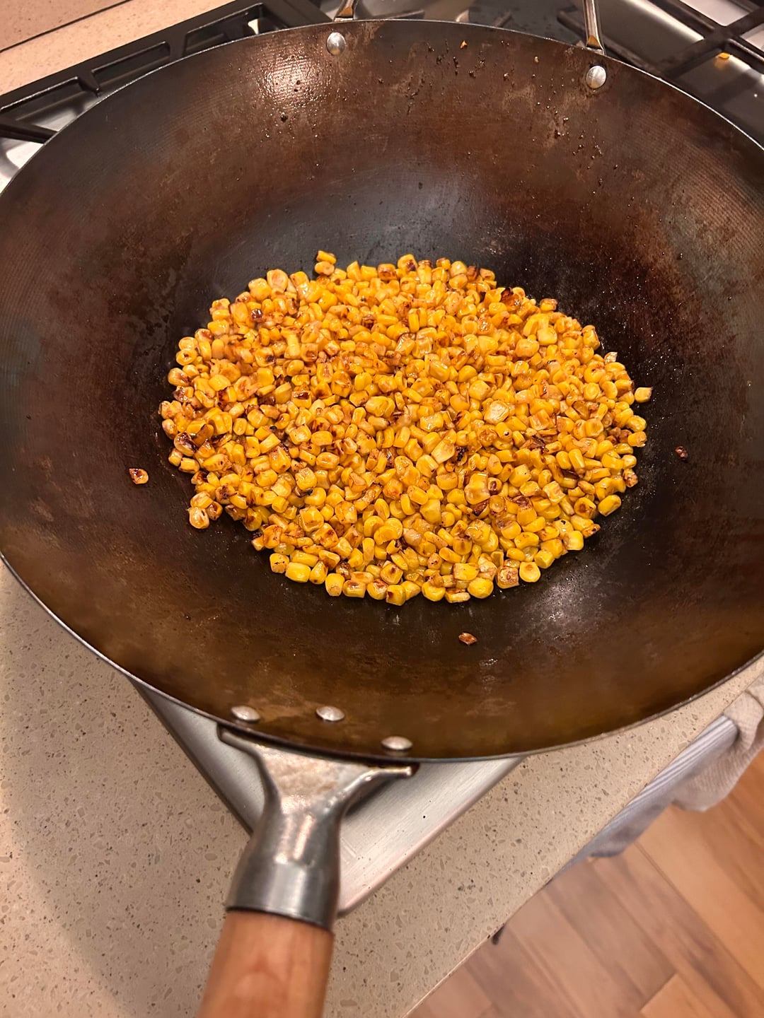 Corn charred up in the wok before adding to a mix of cilantro, jalapeño, scallions, garlic, cojita cheese, and mayo. Seasoned with some chili powder and lime juice.