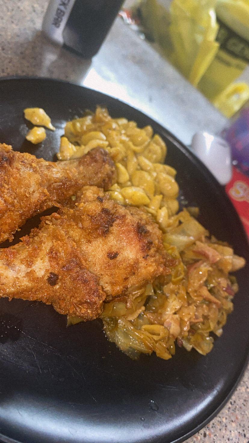 Air fryer breaded pork chops with oven baked broccoli and cauliflower, and a side of garlic Alfredo pasta.