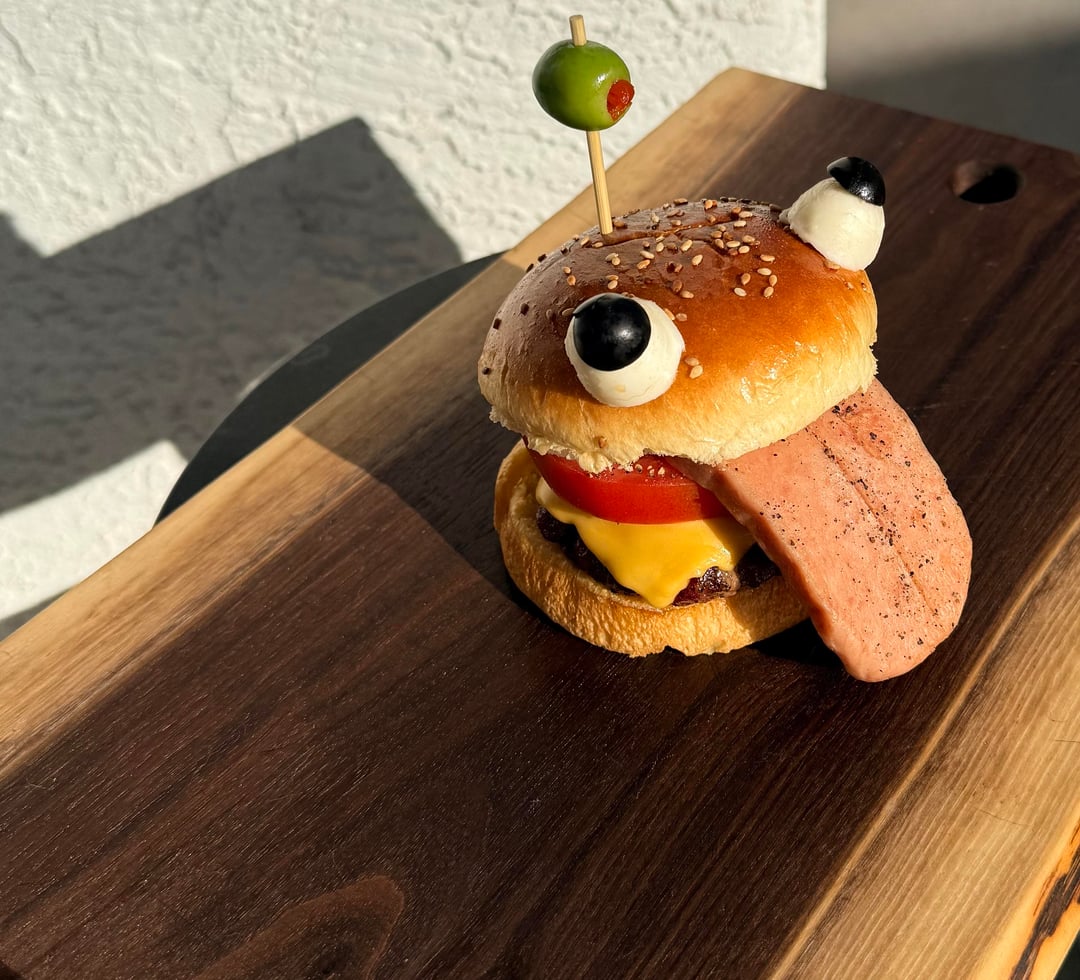 This is from the game Fortnite. I made this for my son, he enjoys the game and this skin. Just wanted to do something fun for him. I focused on matching the Fortnite look, not making a burger how we eat it. Mozzarella balls with cut black olive centers for the eyes, a lightly seared slice of spam with black pepper for the tongue, and a thick-cut tomato to match the character. After the fun reaction and pictures we disassembled it to make it how he likes.