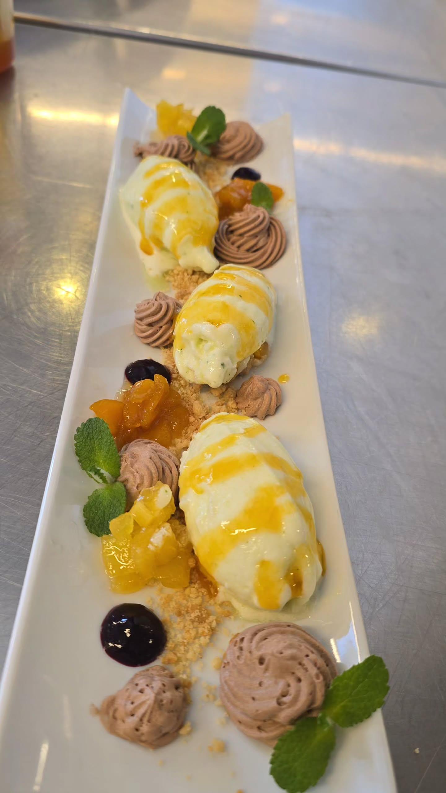 Sharing another angle of the composition. I really wanted to highlight the contrast between the textures of the mousse and the freshness of the mint quenelles. What do you think about the color balance?
