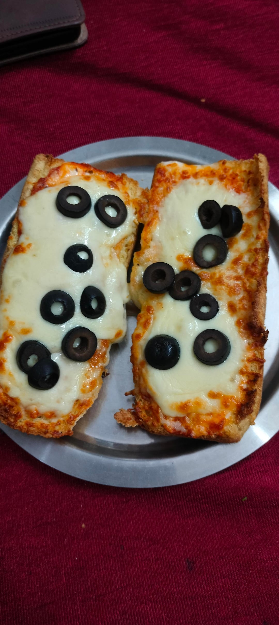 Baked my own bread and then loaded it with some homemade tomato sauce, mozzarella cheese and olives.