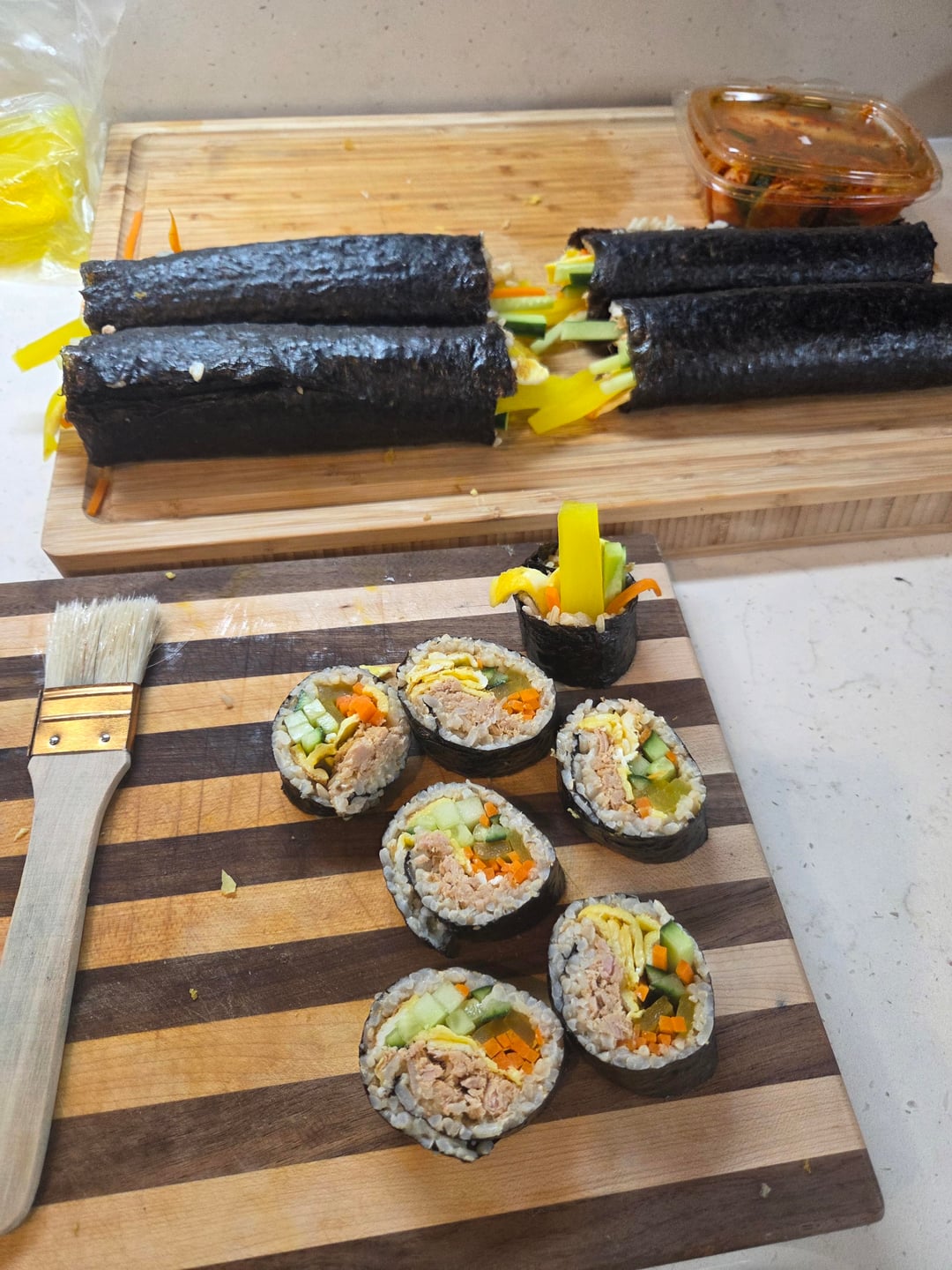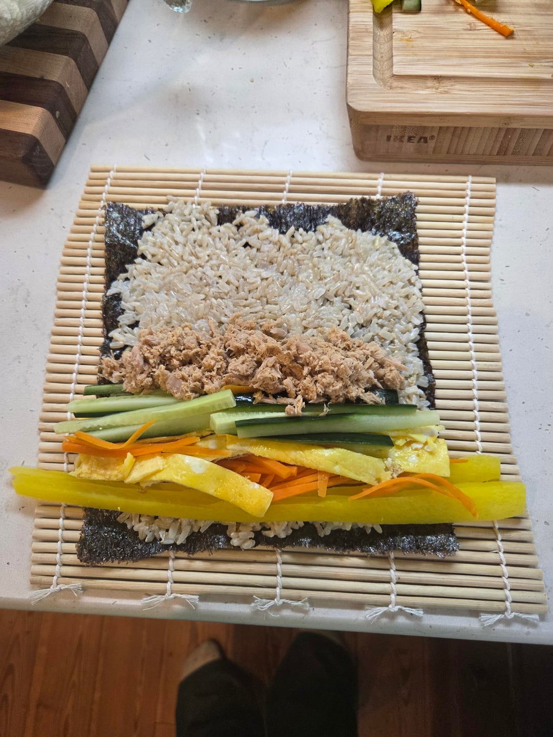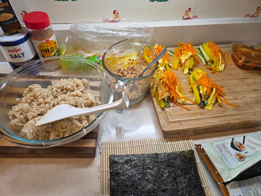 I've been super consistent lately but dreading my usual meals. Made gimbap instead! Brown rice and canned tuna helped me keep the calories to 290-330 calories per roll. This made 5 rolls.
