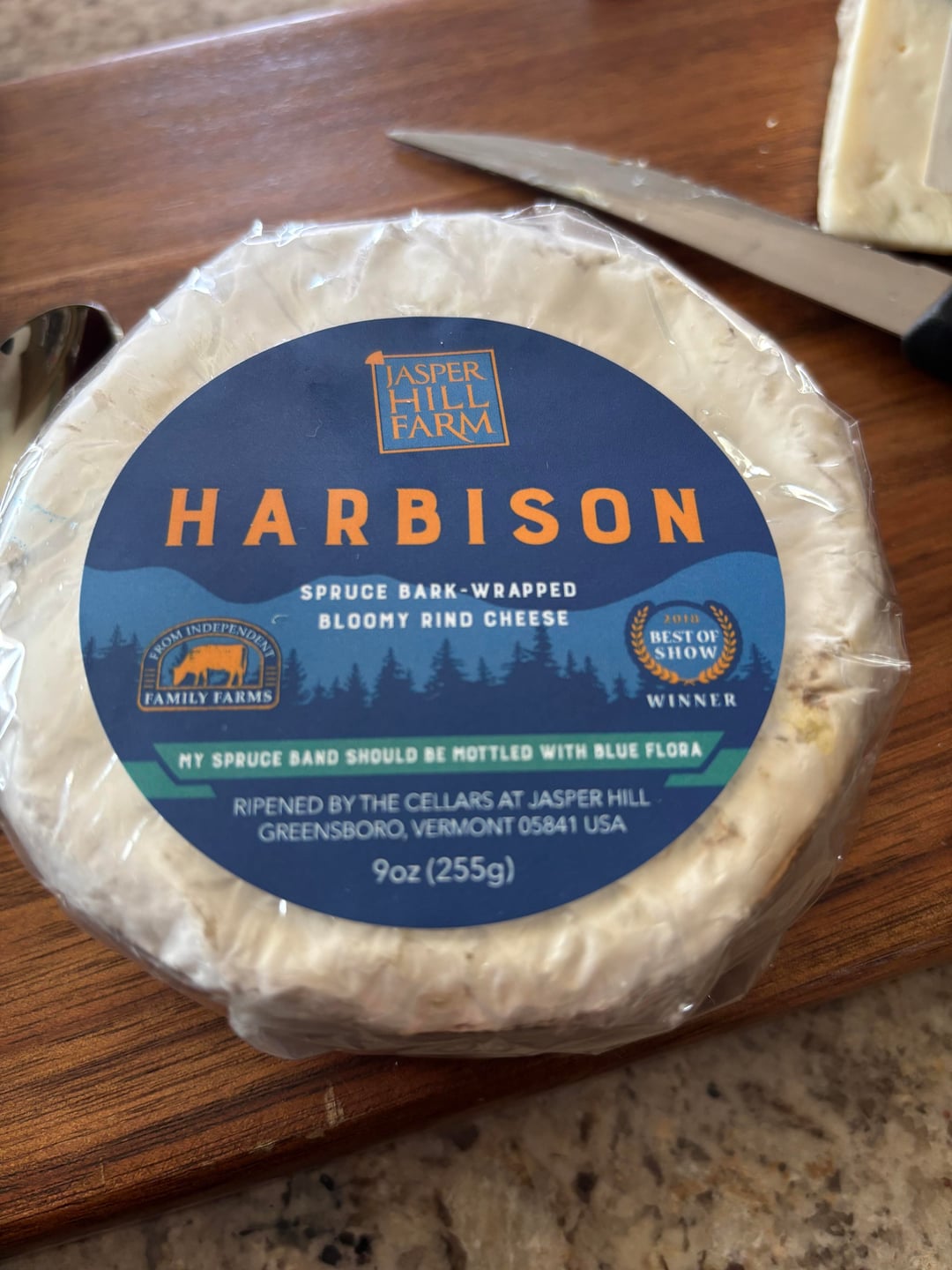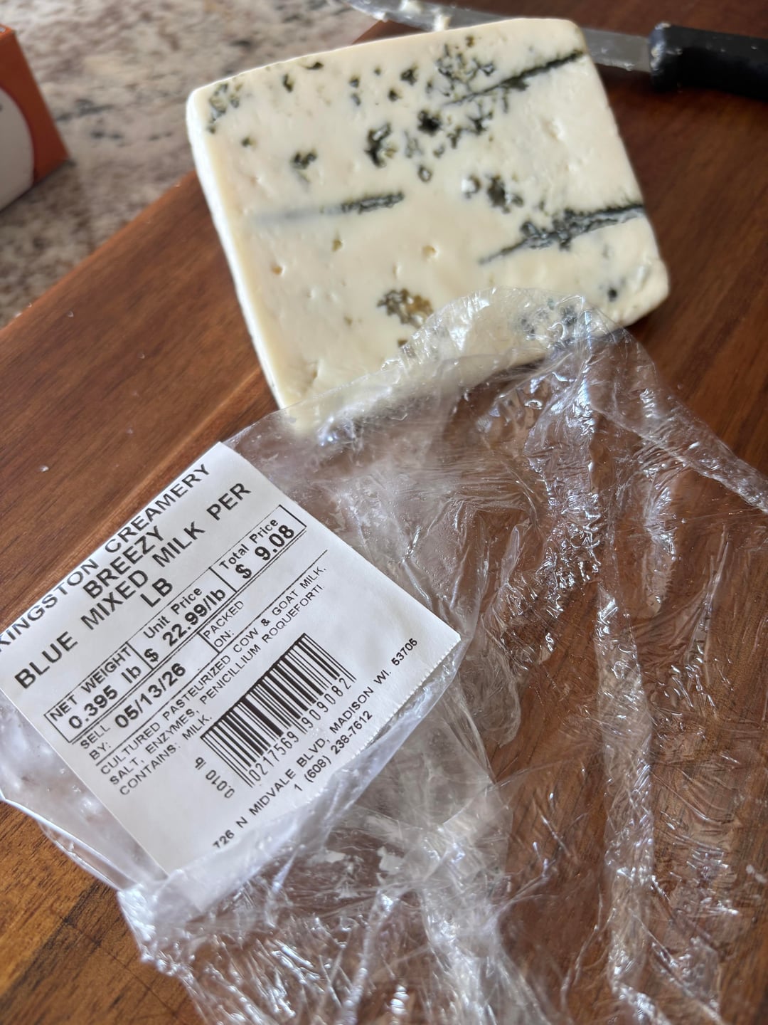 I took the top off the harbison and will pop it into the oven when guests arrive. The Kingston Breezy Blue is a goat/cow blend with lovely pockets of crunchy flavor.