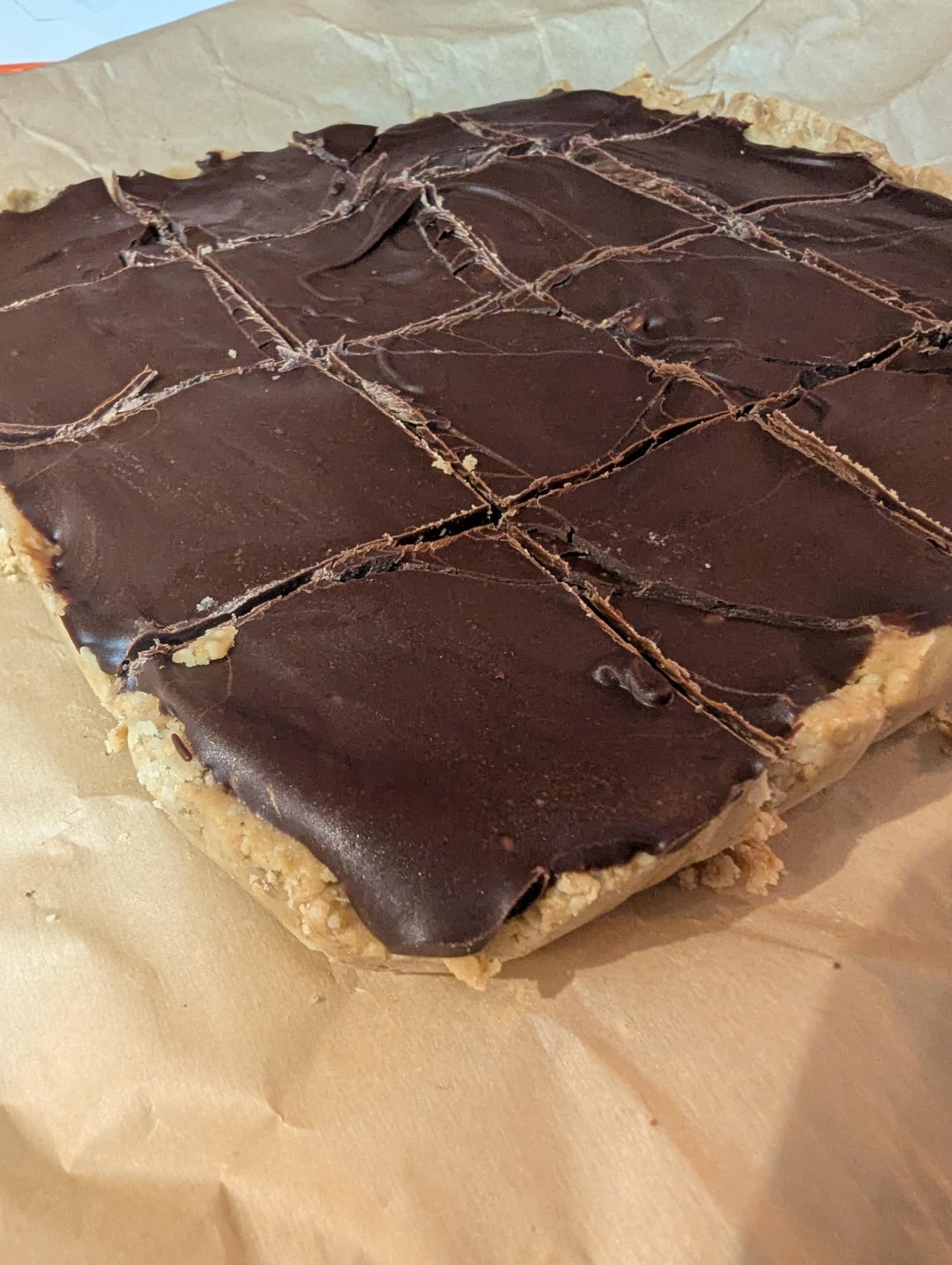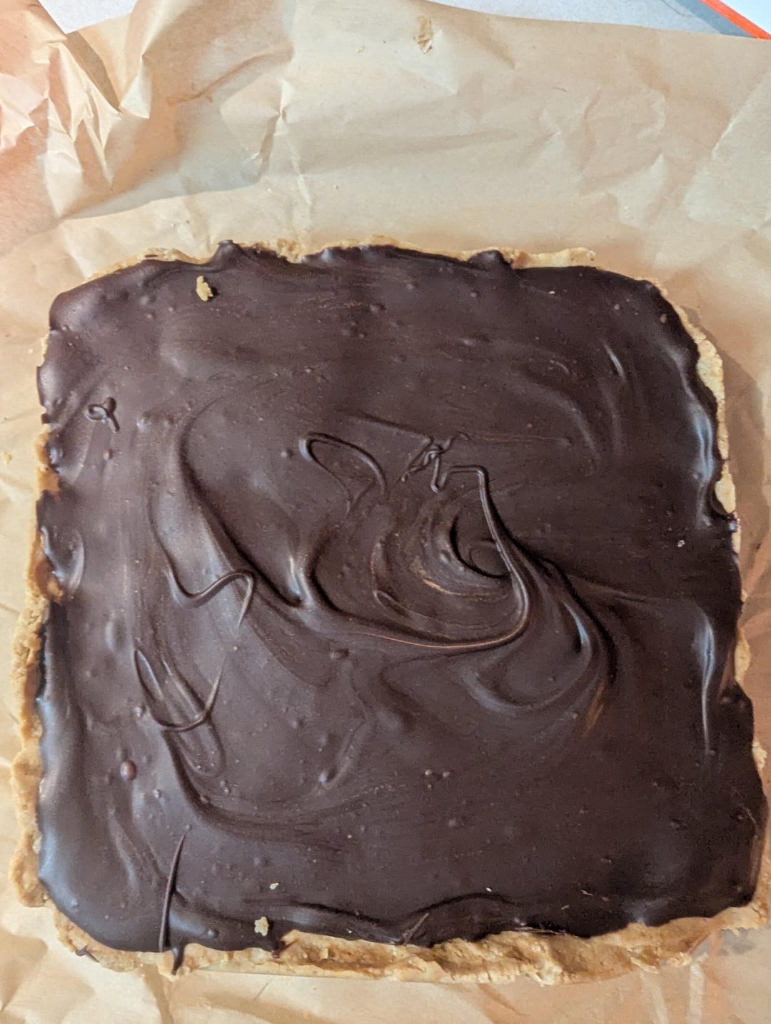 In an 8×8 square pan lined with parchment paper, evenly spread peanut butter bar mix and set aside.