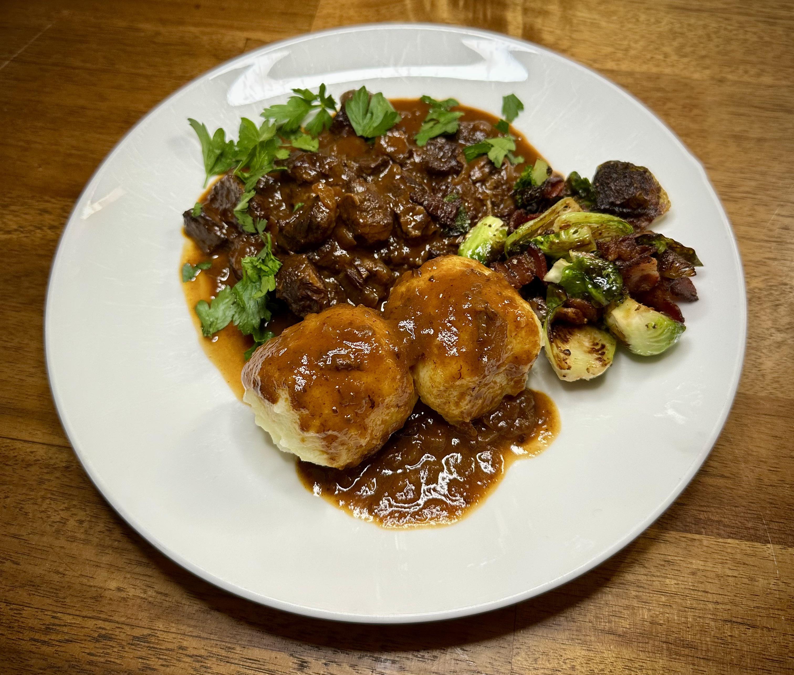 Braised Beef in Broth, Onions and Red Wine served with Potato Dumplings and Brussels Sprouts sautéed with Bacon.