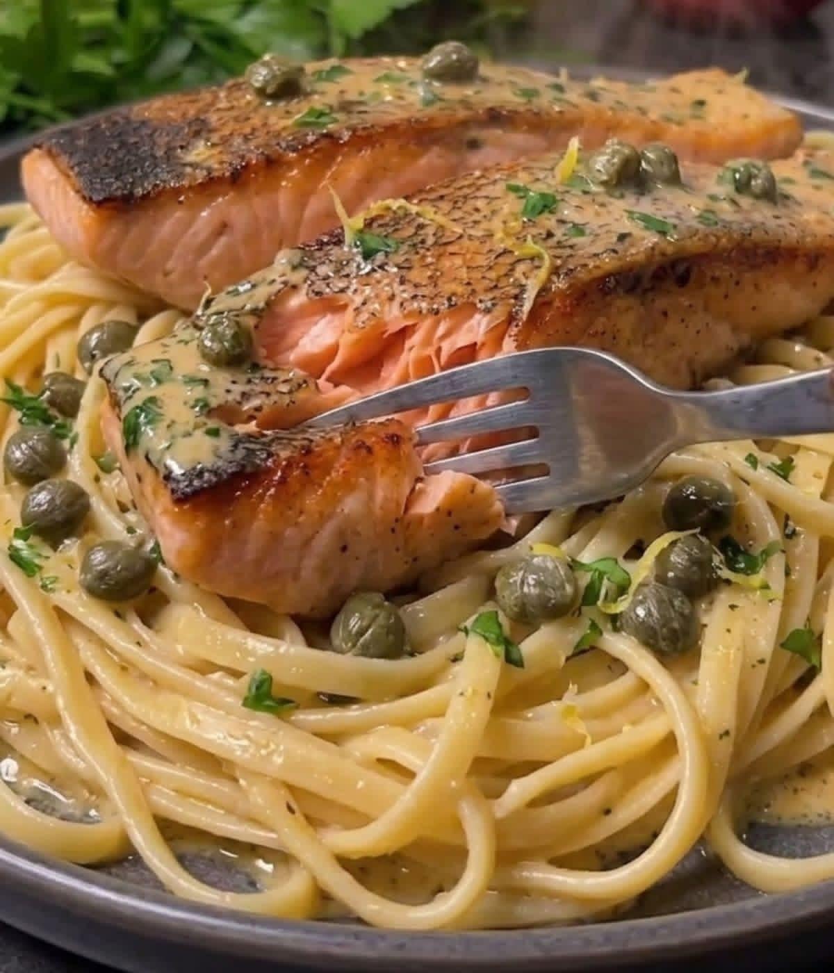 Pan-seared salmon over creamy lemon caper pasta. The flake was perfect! 🍣 by AmalRecipes Dinner Tonight Tonight's Dinner